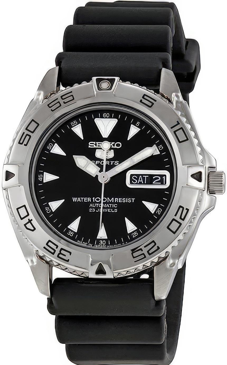 Мужские наручные часы Seiko Seiko 5 Sports SNZB33J2. Механические с ручным подзаводом. Полимерный ремешок. Натуральный полимерный материал является идеальным для изготовления ремешка благодаря своей чрезвычайной прочности и гибкости. Браслет из нержавеющей стали. Прочное, устойчивое к царапинам минеральное стекло защищает часы от повреждений. На циферблате отображается текущее число месяца и день недели. Часы являются водонепроницаемыми до 10 Бар. Цвет циферблата: Серебристый. Цвет корпуса: Черный. На стрелки и отметки нанесен светонакопительный состав, благодаря этому считывать информацию с циферблата возможно и в темноте. Толщина: 11 мм. Гарантия: 2 года.