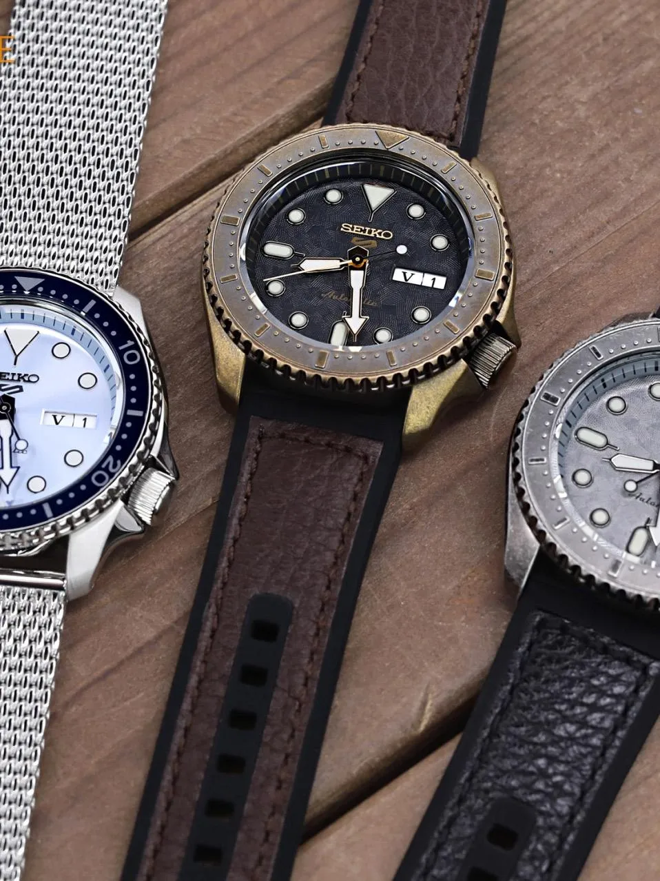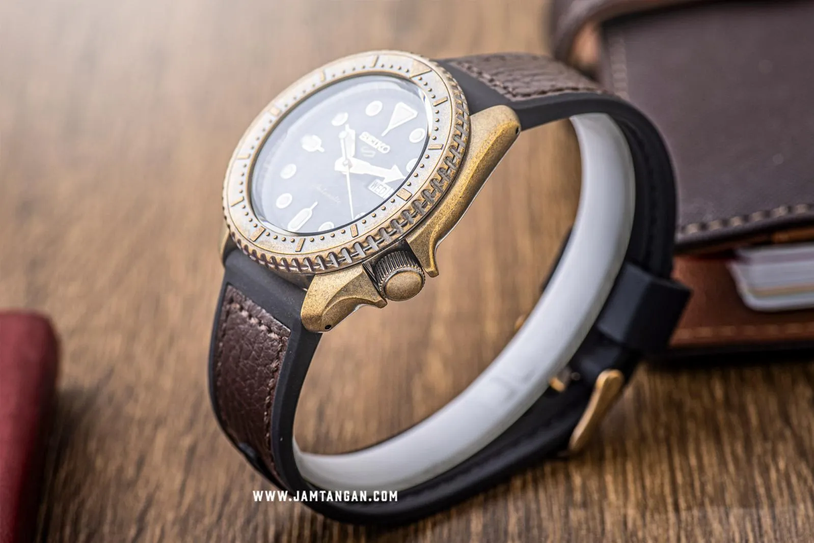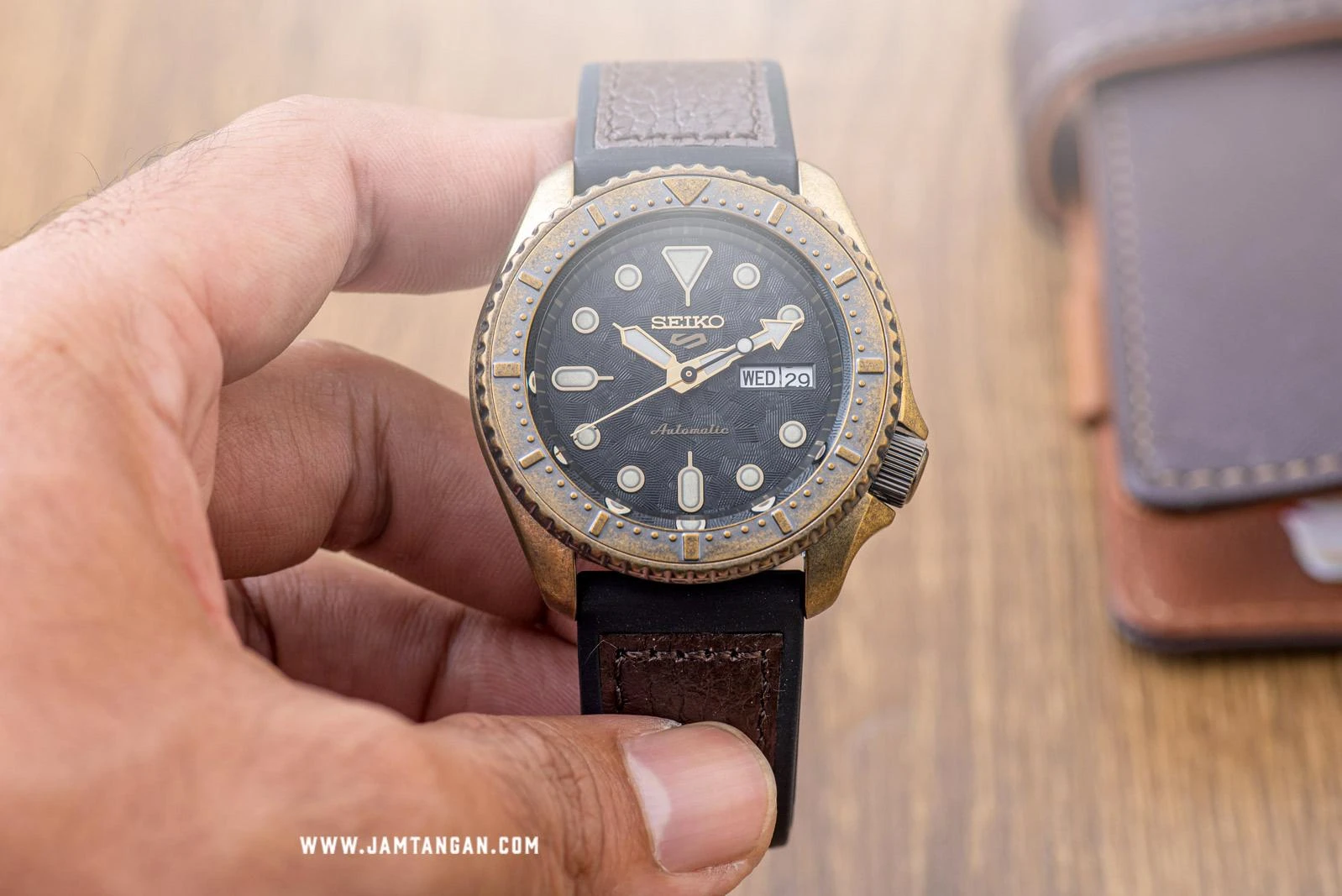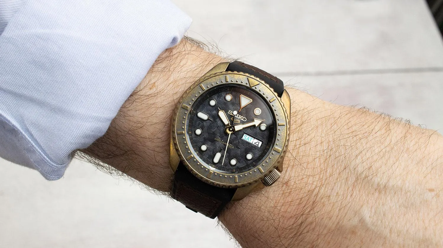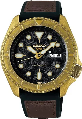 Новейшая реинкарнация легендарной линейки Seiko 5. Формы приобрели современные очертания и размеры. Корпус часов состарен. Циферблат имеет нестандартную фактуру.