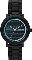 Мужские кварцевые часы из серии Aaren Ocean. Круглый пластиковый черный корпус. Черный циферблат с голубым рисунком-имитацией волн. Метки в виде штрихов. Минеральное стекло. Водозащита 30 м. Черный пластиковый браслет. Раскладывающаяся застежка.
