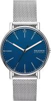 Мужские наручные часы Skagen Signatur SKW6904. Точный кварцевый механизм с аналоговой индикацией. Браслет из нержавеющей стали. Браслет из нержавеющей стали. Прочное, устойчивое к царапинам минеральное стекло защищает часы от повреждений. Часы являются водонепроницаемыми до 5 Бар. Цвет циферблата: Серебристый. Цвет корпуса: Синий. На стрелки и отметки нанесен светонакопительный состав, благодаря этому считывать информацию с циферблата возможно и в темноте. Толщина: 10 мм. Гарантия: 2 года.