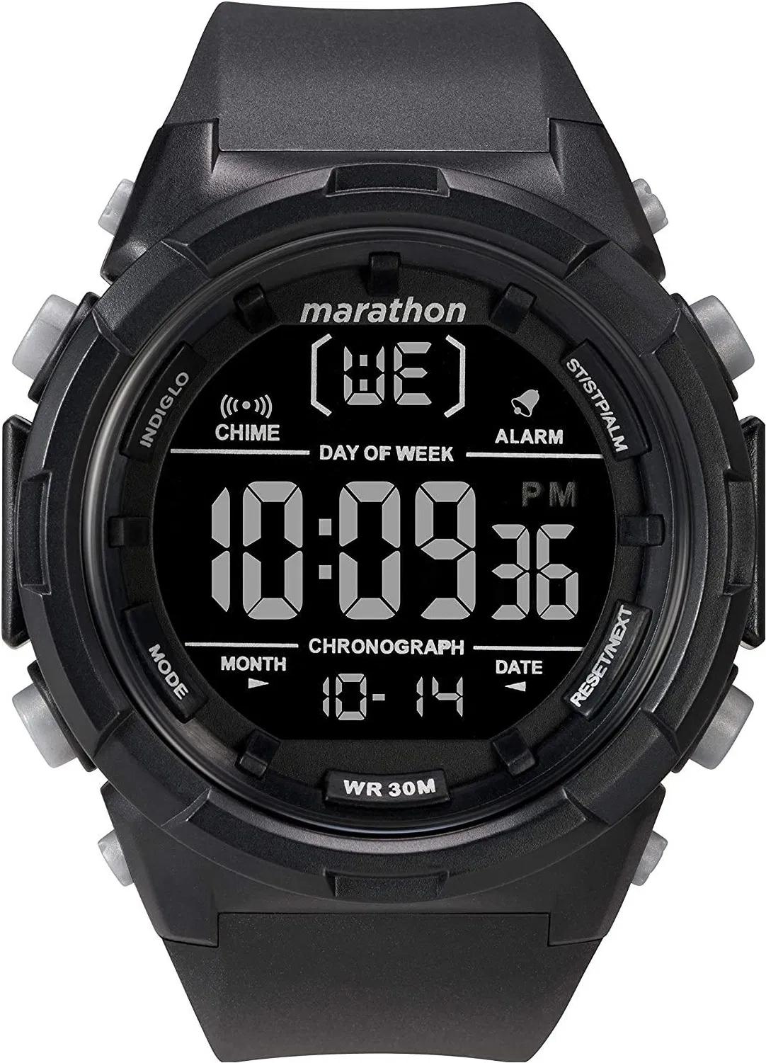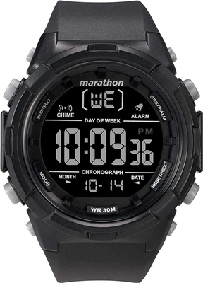 Мужские электронные часы с функциями календаря, секундомера и будильника из серии Marathon. Круглый пластиковый корпус черного цвета со стальной задней крышкой. Пластиковое стекло. Черный силиконовый ремешок. Простая пряжка. Водозащита 30 м.