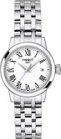 Элегантные оригинальные часы Tissot Classic Dream Lady T129.210.11.013.00 — это современная классика и изысканный дизайн, который подойдет как для формальных, так и для повседневных образов. Данные женские часы произведены в Швейцарии и оснащены надежным швейцарским кварцевым механизмом, имеющим калибр 8 3/4''' и полезную функцию EOL, которая укажет на окончание срока службы батареи типа Renata 364. Вес модели составляет 74 г, она заключена в круглый корпус из нержавеющей стали 316L диаметром 28 мм, толщина корпуса — 7,1 мм. Циферблат белого цвета с римскими индексами защищен устойчивым к появлению царапин сапфировым стеклом. Браслет, изготовленный из нержавеющей стали серого цвета, оснащен застежкой «бабочка» с кнопками. Водозащита этих швейцарских часов составляет 50 метров (5 АТМ/bar): выдерживают мытье рук, попадание крупных капель.