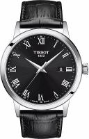 В продаже оригинальные часы Tissot Classic Dream — элегантные мужские часы с классическим вневременным дизайном, которые станут идеальным аксессуаром как для делового, так и для повседневного образа. Эти швейцарские часы выполнены из нержавеющей стали 316L в круглом корпусе толщиной 8,05 мм, а вес составляет всего 56 г, что делает их очень комфортными при ношении. Диаметр корпуса 42 мм, ширина ушка 22 мм. Часы оснащены надежным швейцарским кварцевым механизмом калибра 11 1/2''' с функцией EOL (индикатор заряда батареи), который питается от батареи типа Renata 371. Циферблат черного цвета защищен устойчивым к царапинам сапфировым стеклом и украшен римскими цифрами. Водозащита 50 метров (5 АТМ/bar): выдерживают мытье рук, попадание крупных капель. Завершает образ черный кожаный ремешок длиной 120/80 мм с классической застежкой, который благодаря функции быстрой замены легко можно заменить.