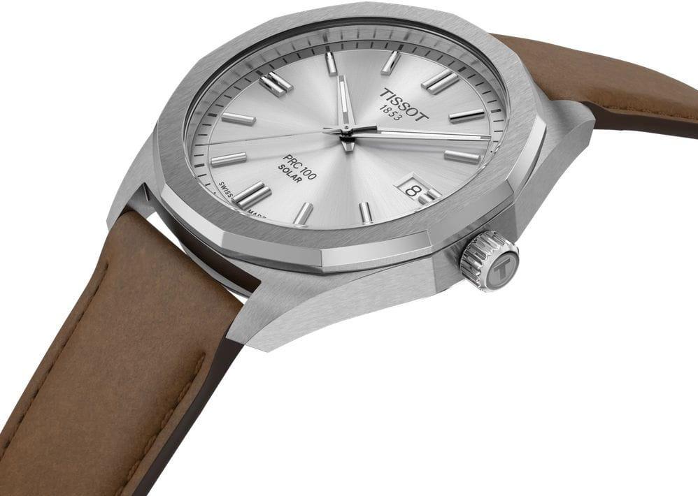 Изысканные мужские оригинальные часы Tissot PRC 100 Solar Quartz 39mm — символ надежности и передовых технологий, который моментально завоевал признание благодаря своему яркому дизайну. В основе этой модели лежит инновационный швейцарский кварцевый механизм Lightmaster Solar, использующий фотоэлектрическую энергию: часы легко заряжаются как от естественного, так и от искусственного света, что делает их невероятно удобными. Корпус круглой формы диаметром 39 мм и толщиной 9,22 мм выполнен из высококачественной нержавеющей стали 316L, а эффектный двенадцатигранный безель придает модели уверенный и запоминающийся вид. Защиту циферблата серебристого цвета с индексами обеспечивает устойчивое к царапинам сапфировое стекло. Стрелки с люминесцентным покрытием Super-LumiNova гарантируют превосходную читаемость в любых условиях. Водостойкость 10 бар (100 м) означает, что часы подходят для плавания и погружения на глубину 5-7 м (выдвигать заводную головку и нажимать кнопки, находясь в воде, нельзя). Модель оснащена функцией индикации окончания запаса хода, что обеспечивает оптимальную производительность. Общий вес изделия составляет 62 г. Эти швейцарские часы комплектуются кожаным ремешком коричневого цвета со стандартной застежкой, который можно легко заменить благодаря системе быстрой замены.