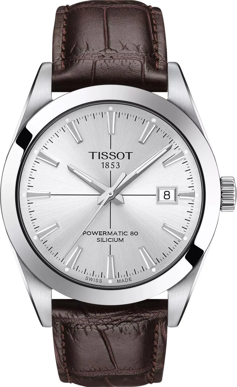 Откройте для себя превосходный образец часового искусства — мужские часы Tissot Gentleman Powermatic 80 Silicium. Эти оригинальные часы являются идеальным стильным аксессуаром на каждый день, они классические и элегантные, а диаметр корпуса 40 мм позволяет им идеально сочетаться с любым стилем. Корпус выполнен из нержавеющей стали 316L, а задняя крышка имеет прозрачное окошко, позволяющее любоваться работой швейцарского автоматического механизма Powermatic 80, который оснащен запатентованной кремниевой пружиной баланса, обеспечивающей запас хода до 80 часов. Диаметр калибра составляет 25,6 мм (11 1/2'''), толщина корпуса — 11,5 мм. Круглое серебристое поле циферблата с индексами защищено выпуклым, устойчивым к появлению царапин сапфировым стеклом с антибликовым покрытием, а стрелки обработаны люминесцентным составом Super-LumiNova. Вес изделия — 87 г. Эти часы поставляются с коричневым кожаным ремешком, который оснащен застежкой-бабочкой с кнопками и имеет возможность быстрой замены. Длина ремешка составляет 120 мм в части «6 часов» и 75 мм в части «12 часов», а крепление ушек — 21 мм. Водонепроницаемость 100 метров (10 АТМ/bar): подходят для плавания и погружения на глубину 5–7 м (выдвигать заводную головку и нажимать кнопки, находясь в воде, нельзя).