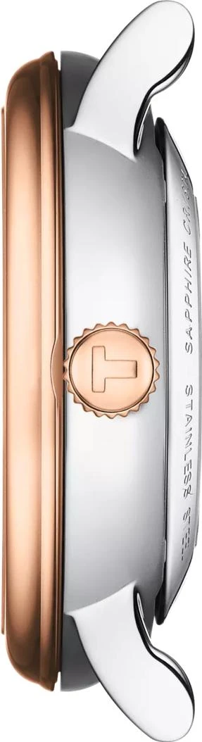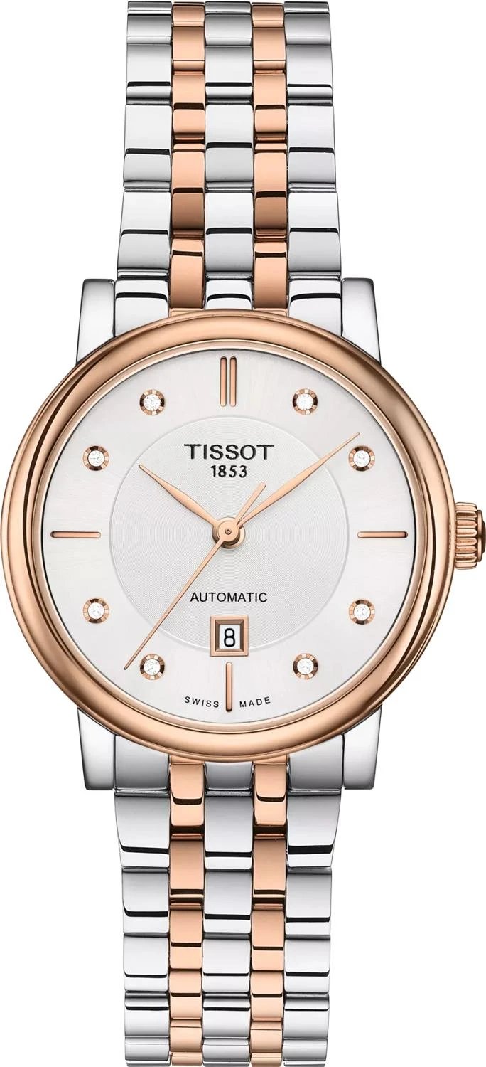 Представляем вашему вниманию оригинальные часы Tissot Carson Premium Automatic Lady с артикулом T122.207.22.036.00 — это неподвластное времени изделие, которое будет уместно в любой ситуации и в любом месте. Эти элегантные женские часы работают на швейцарском автоматическом механизме Swiss Made с калибром 7 3/4''' и функцией отображения часов, минут, секунд и даты (HMSD), а запас хода механизма составляет 38 часов. Корпус круглой формы диаметром 30 мм, толщиной 9,48 мм выполнен из нержавеющей стали 316L с PVD-покрытием цвета «розовое золото», а прозрачная задняя крышка позволяет любоваться движением механизма ЕТА 2671, декорированного «волнами времени». Циферблат чистого серебристого цвета имеет углубление в центре и украшен индексами с 8 бриллиантами Top Wesselton общим весом 0.04 карата с огранкой 8/8 Single cut и чистотой VS-SI, которые придают ему особую глубину благодаря игре внешнего сатинированного солнечного и внутреннего спирального узоров. Защиту циферблата обеспечивает выпуклое, устойчивое к появлению царапин сапфировое стекло с антибликовым покрытием, а стальной браслет с PVD-покрытием в серо-золотом цвете оснащен застежкой-бабочкой с кнопками. Вес модели составляет 70 г, ширина ушек — 15 мм. Водонепроницаемость этих швейцарских часов составляет 50 метров (5 АТМ/bar): они выдерживают мытье рук, попадание крупных капель.