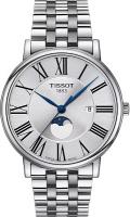 Оригинальные часы Tissot Carson Premium Gent Moonphase — идеальный инструмент, чтобы помнить, что жизнью нужно наслаждаться каждую минуту и из каждой секунды извлекать максимум, они восхищают своей простотой и вневременным элегантным стилем, а модель с индикатором фаз Луны является выражением высокого часового искусства. Эти мужские часы имеют круглый корпус диаметром 40 мм и толщиной всего 7,62 мм, выполненный из нержавеющей стали 316L, и оснащены швейцарским кварцевым механизмом (калибр 10 1/2''' с диаметром 23.30 мм) с индикацией окончания заряда батареи (EOL) и индикатором фаз Луны, питающимся от батареи Renata 371. Циферблат серебристого цвета с римскими индексами защищен устойчивым к царапинам сапфировым стеклом. Серые часы комплектуются браслетом из нержавеющей стали с застежкой-бабочкой с кнопками. Водозащита 50 метров (5 АТМ/bar): выдерживают мытье рук, попадание крупных капель.