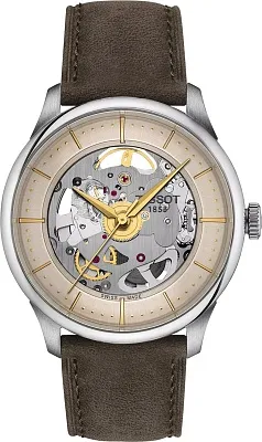 Изысканные мужские оригинальные часы Tissot Chemin Des Tourelles Skeleton — это не просто аксессуар, а часть истории легендарного бренда. Название модель получила в честь улицы в Ле Локле в Швейцария, где в 1907 году была основана и до сих пор находится фабрика Tissot. Современный дизайн часов идеально сочетается с высоким качеством швейцарского автоматического механизма Powermatic 80, обеспечивая классический и элегантный стиль. Корпус часов выполнен из нержавеющей стали 316L, имеет диаметр 39 мм и толщину 11,22 мм, дополнен прозрачной задней крышкой, открывающей вид на работу механизма. Вес изделия составляет 63 г. Швейцарские часы оснащены куполообразным устойчивым к царапинам сапфировым стеклом с антибликовым покрытием. Модель с бежево-прозрачным циферблатом с индексами и зеленым кожаным ремешком с быстросъемным креплением оснащена запатентованной балансовой пружиной Nivachron и имеет запас хода до 80 часов. Диаметр калибра составляет 25,6 мм (11 1/2'''). Уровень водонепроницаемости 50 метров (5 АТМ/bar): выдерживают мытье рук, попадание крупных капель.