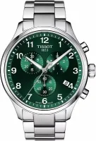 Представляем вашему вниманию Tissot Chrono XL Classic — оригинальные часы, которые подчеркнут вашу индивидуальность и городской стиль. Это мужские швейцарские часы с впечатляющим диаметром корпуса 45 мм и толщиной 11,02 мм. Круглый корпус изготовлен из прочной нержавеющей стали 316L, а циферблат насыщенного зеленого цвета защищен устойчивым к появлению царапин сапфировым стеклом. Оснащенные точным швейцарским кварцевым механизмом (калибр 13\ 1/4''', диаметр 29,8 мм) с индикатором заряда батареи EOL, эти часы также имеют функцию хронографа: 30-минутные счетчики и счетчики 1/10 секунды, центральную 60-секундную стрелку хронографа, а также функции ADD и SPLIT. На стрелки нанесено люминесцентное покрытие Super-LumiNova, обеспечивающее отличную читаемость арабских индексов. Модель комплектуется серым браслетом из нержавеющей стали с раскладной застежкой с кнопками. Вес изделия составляет 175 г. Уровень водозащиты 100 метров (10 АТМ/bar): подходят для плавания и погружения на глубину 5-7 м (выдвигать заводную головку и нажимать кнопки, находясь в воде, нельзя). Коллекция Tissot Chrono XL предлагает множество стилей, но вне зависимости от выбора, Tissot Chrono XL Classic точно раскроют вашу индивидуальность.