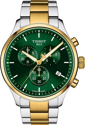 Название этой модели — Tissot Chrono XL Classic — говорит само за себя: это один из самых больших хронографов в коллекции швейцарских часов с корпусом 45 мм. Эти мужские оригинальные часы станут прекрасным выбором для ценителей спортивной элегантности и швейцарских технологий, заключенных в прочный корпус из нержавеющей стали 316L, дополненный PVD-покрытием под желтое золото. В сердце модели Tissot Chrono XL Classic бьется надежный кварцевый механизм Swiss quartz с калибром 13 1/4''' и диаметром 29,8 мм, оснащенный функцией EOL (индикация заряда батареи). Среди полезных функций — счетчики на 30 минут и 1/10 секунды, центральная 60-секундная стрелка хронографа, а также функции ADD и SPLIT. Вес часов составляет 175 г, толщина корпуса — 11,02 мм. Зеленый циферблат с индексами защищен устойчивым к царапинам сапфировым стеклом. Люминесцентный состав Super-LumiNova на стрелках обеспечивает отличную читаемость в темноте. Водозащита 100 метров (10 АТМ/bar): подходят для плавания и погружения на глубину 5-7 м (выдвигать заводную головку и нажимать кнопки, находясь в воде, нельзя). Часы комплектуются браслетом из нержавеющей стали с PVD-покрытием, выполненным в сером цвете и цвете желтого золота 1N14, и застежкой-бабочкой с кнопками.