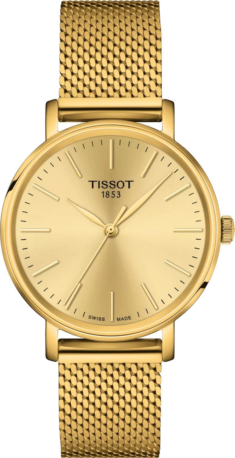 Элегантность, чистота линий и шик — вот что воплощают собой оригинальные часы Tissot Everytime Lady, артикул T143.210.33.021.00, созданные для современных представительниц прекрасного пола. Классический, вневременной дизайн и стильный, четкий циферблат подчеркивают актуальный характер этой модели, а название коллекции «Everytime» говорит само за себя: каждое мгновение — ваше время. Эти прекрасные женские часы произведены в Швейцарии, о чем свидетельствует гравировка «Swiss quartz» на механизме. Они оснащены надежным швейцарским кварцевым механизмом калибра 10 1/2''' с диаметром 23,3 мм, работающим от батареи Renata 371. Круглый корпус часов диаметром 34 мм и толщиной 6.92 мм, а также браслет-миланское плетение выполнены из нержавеющей стали 316L с PVD-покрытием цвета желтого золота, что придает модели изысканный вид. Браслет имеет ювелирную застежку с фиксатором и оснащен системой быстрой замены без использования инструментов, обеспечивая максимальную универсальность. Масса часов составляет 66 граммов. Циферблат цвета «Шампань» украшен индексами и защищен устойчивым к царапинам сапфировым стеклом. Уровень водозащиты 50 метров (5 АТМ/bar): выдерживают мытье рук, попадание крупных капель. Выбирая швейцарские часы Tissot Everytime Lady, вы получаете не просто аксессуар, а идеальное дополнение к любому образу.