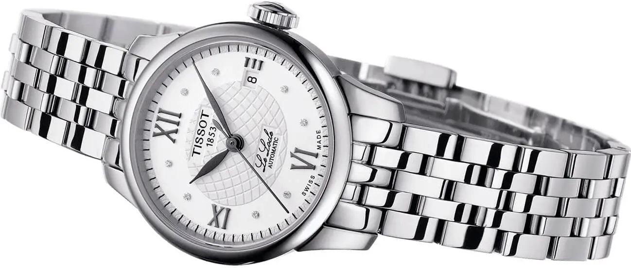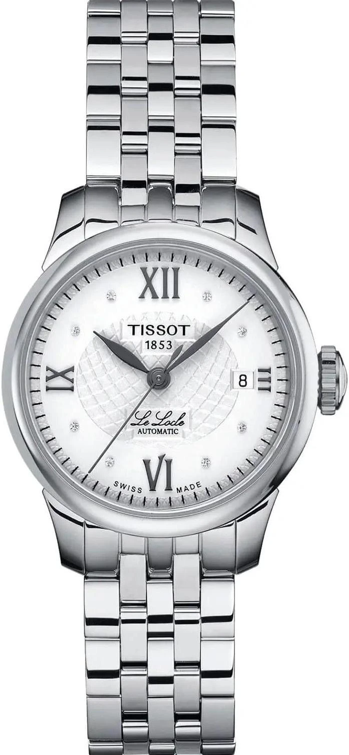 Воплощение элегантности и мастерства швейцарских часов — модель Tissot Le Locle 25.3mm (артикул T41.1.183.16) получила свое название в честь исторической родины бренда Tissot, колыбели часового дела, и несет в себе ДНК марки и ее ценности. Эти оригинальные часы являются идеальным примером классического шика: в круглом корпусе из нержавеющей стали 316L, диаметр которого составляет 25.3 мм, а толщина — 8.4 мм, скрыт надежный швейцарский автоматический механизм, калибр 7 3/4''' с запасом хода 38 часов. Серебристый циферблат часов защищен устойчивым к царапинам сапфировым стеклом и украшен изысканными деталями — римскими цифрами и восемью бриллиантами (характеристики бриллиантов: 0.01 карат, чистота VS-SI, цвет Top Wesselton, огранка 8/8 Single cut), что придает этому аксессуару поистине роскошный вид. Благодаря функциям «часы, минуты, секунды, дата» (HMSD) эти женские часы станут незаменимым спутником как в дневное время, так и во время вечерних выходов. Масса модели 62 г, ширина ушка — 12 мм. Корпус обладает минимальной защитой от мелких брызг (30 метров / 3 АТМ/bar): часы не предназначены для погружения в воду. Элегантная отделка браслета из нержавеющей стали серого цвета дополнена удобной застежкой «бабочка» с кнопками.