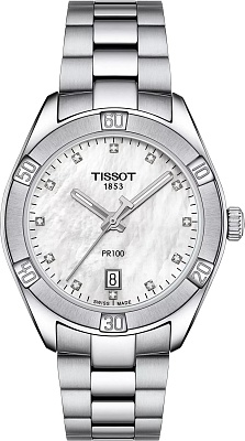 Взгляните на оригинальные часы Tissot PR 100 Sport Chic 36mm с артикулом T101.910.11.116.00, которые являются одним из самых популярных моделей в коллекции бренда, идеально сочетая в себе неподвластный времени дизайн и спортивные детали, что делает их прекрасным выбором для современных женских часов. Эти швейцарские часы оснащены высокоточным кварцевым механизмом, калибр которого составляет 10 1/2''', с диаметром 23.3 мм, работающим от батареи типа Renata 371. Круглый корпус часов, изготовленный из прочной нержавеющей стали 316L, имеет длину и ширину 36 мм, при толщине всего 9 мм, что делает их элегантными на запястье, а вес модели составляет 112 г. Циферблат, выполненный из белого перламутра, украшен 12 бриллиантовыми индексами в огранке «8/8 Single cut» чистотой VS-SI и цветом Top Wesselton, общим весом 0.05 карата, что придает часам изысканный блеск. Для превосходной читаемости в любое время суток стрелки покрыты люминесцентным составом Super-LumiNova, а надежную защиту циферблату обеспечивает устойчивое к царапинам сапфировое стекло с антибликовым покрытием. Браслет из нержавеющей стали серого цвета оснащен удобной раскладной застежкой с кнопками. Водозащита этих часов составляет 100 метров (10 АТМ/bar): подходят для плавания и погружения на глубину 5-7 м (выдвигать заводную головку и нажимать кнопки, находясь в воде, нельзя).