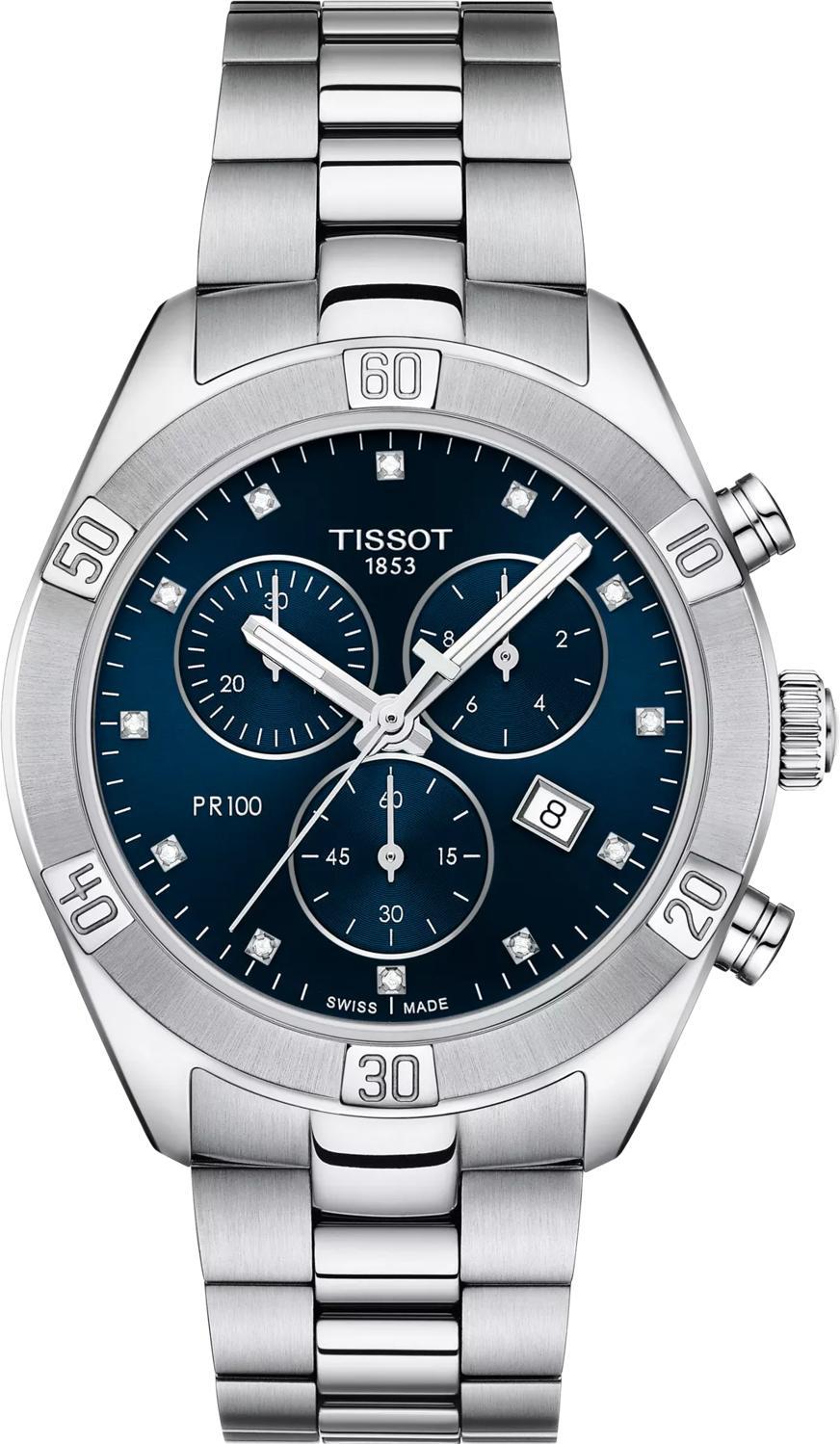 Откройте для себя очарование и точность оригинальных часов Tissot PR 100 Sport Chic Chronograph (артикул T101.917.11.046.00), идеальных для современной женщины. Эта модель, несмотря на свою прочность, не забывает о женственной эстетике, предлагая дизайн в стиле спорт-шик, который является не только элегантным, но и практичным. Круглый корпус и браслет из нержавеющей стали 316L, отличающиеся серым цветом, оснащены складной застежкой с кнопками, а синий циферблат надежно защищен устойчивым к появлению царапин сапфировым стеклом. Сердцем этих женских часов является точный швейцарский кварцевый механизм (калибр 10 1/2''' с диаметром 23,3 мм), оснащенный индикатором EOL, который предупредит о необходимости замены элемента питания типа Renata 394. Хронограф включает центральную 60-секундную стрелку, а также 30-минутные и 1/10-секундные счетчики с функциями ADD и SPLIT. На циферблате в качестве индексов расположены 12 бриллиантов (8/8 Single cut, цвет Top Wesselton, чистота vs-si, общим весом 0,05 карата), которые добавляют роскошного блеска, а люминесцентное покрытие Super-LumiNova на стрелках обеспечивает идеальную видимость в любых условиях. Часы имеют ширину 38 мм, длину 38 мм и толщину 10,5 мм, а крепление ушек составляет 19 мм. Вес изделия — 139 г. Эти часы водонепроницаемы до давления 10 бар (100 м), что означает, что они подходят для плавания и погружения на глубину 5–7 м (важно: выдвигать заводную головку и нажимать кнопки, находясь в воде, нельзя).