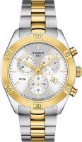 Представляем вам оригинальные часы Tissot PR 100 Sport Chic Chronograph (артикул T101.917.22.031.00) из Швейцарии, где традиции часового искусства сочетаются с современным дизайном. Эта модель, созданная в Швейцарии, воплощает силу и при этом не забывает об изящной женской эстетике, что делает ее идеальными женскими часами в стиле спорт-шик. В коллекции PR 100 каждая женщина сможет найти что-то для себя: поклонниц минимализма привлечет чистый циферблат, а любительницы роскоши оценят сияние перламутра на счетчике или циферблаты с эффектом солнечных лучей, декорированные сверкающими индексами-бриллиантами. Круглый корпус диаметром 38 мм и толщиной 10,5 мм изготовлен из нержавеющей стали 316L с PVD-покрытием цвета желтого золота, которое гармонирует с браслетом серого цвета и цвета желтого золота 1N14 с раскладной застежкой на кнопках. Вес часов составляет 139 г. Благодаря устойчивому к царапинам сапфировому стеклу и люминесцентному составу Super-LumiNova на стрелках обеспечивается идеальная видимость, что делает эти швейцарские часы не только стильными, но и практичными. Точный кварцевый механизм (калибр 10 1/2''' с диаметром 23,3 мм) имеет функцию EOL (индикатор окончания ресурса батареи Renata 394), а также является полноценным хронографом с центральной 60-секундной стрелкой и 30-минутными счетчиками и счетчиками 1/10 секунды, включая функции ADD и SPLIT. Серебристый циферблат с индексами надежно защищен от воды — водостойкость 100 метров (10 АТМ/bar): подходят для плавания и погружения на глубину 5-7 м (выдвигать заводную головку и нажимать кнопки, находясь в воде, нельзя).