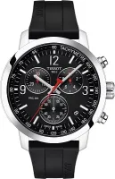 Эти великолепные мужские часы Tissot PRC 200 Chronograph — идеальный выбор для тех, кто ищет сочетание спортивного стиля и классического дизайна. Представленные оригинальные часы разработаны как спортивный, но более классический вариант после успеха спортивной линии Tissot PRS200 и обладают водонепроницаемостью 20 бар (200 м / 660 футов), что позволяет с ними плавать и погружаться с аквалангом на глубину 40 метров. Благодаря уменьшенному безелю, циферблат кажется очень большим, обеспечивая максимально четкое считывание времени, а для улучшенной читаемости индексов и стрелок используется люминесцентное покрытие Super-LumiNova. Эти швейцарские часы с кварцевым механизмом (Swiss quartz) и функцией EOL (индикатор окончания срока службы батареи) имеют калибр 13 1/4''' и диаметр 29,8 мм. Модель весит 88 г и оснащена корпусом из нержавеющей стали 316L круглой формы, с завинчивающейся заводной головкой и задней крышкой, а также устойчивым к царапинам сапфировым стеклом. Диаметр корпуса составляет 43 мм, длина — 42 мм, а толщина — 12,02 мм. На черном циферблате с арабскими цифрами и индексами расположены функции хронографа: 30-минутный и 1/10-секундный счетчики, центральная 60-секундная стрелка хронографа, а также функции ADD и SPLIT. Часы комплектуются черным каучуковым ремешком шириной 20 мм с классической застежкой, который имеет длину 115 мм со стороны "6 часов" и 75 мм со стороны "12 часов" и оснащен системой быстрой смены.