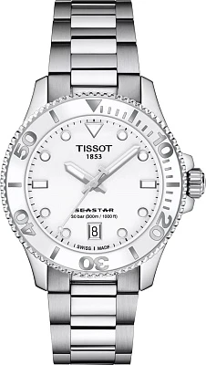 Погрузитесь в мир стиля с оригинальными часами Tissot Seastar 1000 36mm, артикул T120.210.11.011.00 — это ваш пропуск в кристально чистые воды, где сквозь толщу пробиваются солнечные лучи, а разум наполняется безмятежностью. Элегантная, напористая и универсальная модель швейцарских часов выполнена в круглом корпусе диаметром 36 мм и толщиной 9,67 мм из высококачественной нержавеющей стали 316L, отличающейся долговечностью и устойчивостью к коррозии. Защиту циферблата обеспечивает устойчивое к царапинам сапфировое стекло с двусторонним антибликовым покрытием, а важные элементы, такие как стрелки, покрыты люминесцентным составом Super-LumiNova для идеальной читаемости в темноте. Внутри установлен надежный швейцарский кварцевый механизм калибра 10 1/2''' с диаметром 23,30 мм, работающий от батареи типа Renata 371. Женские часы оснащены однонаправленным вращающимся безелем с минеральной вставкой и завинчивающейся заводной головкой, что обеспечивает высокий уровень водозащиты 300 метров (30 АТМ/bar): можно плавать, погружаться с аквалангом на глубину 70 метров. На запястье часы фиксируются стальным браслетом серого цвета с раскладной застежкой с системой блокировки и кнопками. Масса изделия составляет 114 г. С помощью системы быстрой замены браслет легко заменить, меняя образ и открывая двери в другой мир.