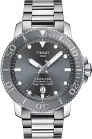 Откройте для себя мужские оригинальные часы Tissot Seastar 1000 Powermatic 80 — идеальное сочетание стиля и высокой производительности, не идущее на компромиссы. Эти швейцарские часы созданы для водных видов спорта, о чем свидетельствует водонепроницаемость до 30 бар (300 м): можно плавать, погружаться с аквалангом на глубину 70 метров. При этом часы имеют заводную головку и заднюю крышку с винтовым креплением. Эта модель объединяет в себе все преимущества механизма Powermatic 80, который обеспечивает запас хода до 80 часов, в то время как большинство автоматических механизмов могут похвастаться только 40 часами. Корпус круглых часов изготовлен из нержавеющей стали 316L, имеет керамический безель с вращением против часовой стрелки, прозрачную заднюю крышку и вес 184 г. Длина корпуса составляет 43 мм, ширина — 43 мм, а толщина — 12,7 мм, расстояние между ушками — 21 мм. Стекло — сапфировое с защитой от царапин и антибликовым покрытием. Внутри установлен швейцарский автоматический механизм калибра 11 1/2''' (диаметр 25,6 мм) с запатентованной спиралью баланса Nivachron. На сером циферблате и стрелках расположены индексы с люминесцентным покрытием Super-LumiNova. Серый браслет из нержавеющей стали оснащен складной застежкой с фиксатором, механизмом удлинения для дайвинга и кнопками.