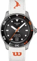 Почувствуйте техническое превосходство и спортивную энергию с оригинальными часами Tissot Seastar Wilson WNBA 40mm, артикул T120.807.17.051.00 — это специальная серия, созданная в честь партнерства Tissot и Женской национальной баскетбольной ассоциации (WNBA). Данные мужские часы оснащены высококачественным швейцарским автоматическим механизмом, гарантирующим точность и надежность, с запатентованной балансовой пружиной Nivachron и внушительным запасом хода до 80 часов. Круглый корпус часов, изготовленный из нержавеющей стали 316L, имеет длину 40 и ширину 40 мм при толщине 12,48 мм, при этом вес составляет 84 г. Среди его особенностей — завинчивающиеся заводная головка и задняя крышка, прозрачная задняя крышка со шелкографией и минеральный безель; однонаправленный вращающийся безель включает 24-секундный отсчет времени для броска в баскетболе, подчеркивая роль Tissot как официального хронометриста WNBA. Черный циферблат с индексами защищен устойчивым к царапинам сапфировым стеклом с антибликовым покрытием, а люминесцентное покрытие Super-LumiNova на корпусе и стрелках обеспечивает отличную читаемость. Швейцарские часы выгодно дополнены белыми и оранжевыми деталями, повторяющими цветовую гамму культового игрового мяча WNBA, а оранжевый синтетический ремешок поставляется со стандартной застежкой, имеет ширину ушек 20 мм и оснащен системой быстрой замены. Водонепроницаемость часов составляет 300 метров (30 АТМ/bar): можно плавать, погружаться с аквалангом на глубину 70 метров.