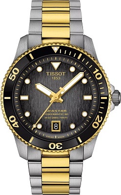 Обновите свою коллекцию с оригинальными часами Tissot Seastar 1000 Powermatic 80 T120.807.22.051.00 — это новая версия одной из основных линеек бренда, теперь представленная в корпусе 40 мм с механизмом Powermatic 80 в сердце, идеальная для тех, кто ищет спортивный, но уверенный аксессуар. Корпус из нержавеющей стали 316L с PVD-покрытием цвета желтого золота получил тонкое обновление — по его краю добавлено изящное углубление, придающее ему более компактный и изысканный вид. Эти мужские часы оснащены высокоточным швейцарским часовым автоматическим механизмом (калибр 11 1/2''', диаметр 25,6 мм) с запатентованной спиралью баланса Nivachron, что гарантирует исключительную точность хода. Запас хода механизма составляет до 80 часов, а сквозь прозрачную заднюю крышку можно наблюдать за его работой. Круглый корпус имеет диаметр 40 мм и толщину 12,48 мм, между ушками расстояние 20 мм. Вес часов — 148 г. Часы обладают водонепроницаемостью 300 метров (30 АТМ/bar): можно плавать, погружаться с аквалангом на глубину 70 метров. Наличие безеля с минеральным кольцом, вращающегося против часовой стрелки, завинчивающейся заводной головки и задней крышки, а также люминисцентного покрытия Super-LumiNova на индексах и стрелках обеспечивает улучшенную видимость в условиях плохой освещенности. Циферблат градиентного серо-черного цвета защищен устойчивым к царапинам сапфировым стеклом с антибликовым покрытием. Браслет из нержавеющей стали с PVD-покрытием серого цвета и цвета желтого золота 1N14 оснащен складной застежкой с фиксатором и кнопками, а также имеет систему быстрой замены.