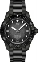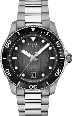 Представляем обновленную версию одной из главных коллекций оригинальных часов Tissot — Seastar 1000 Powermatic 80 с артикулом T120.807.33.051.00, созданную специально для ценителей активного образа жизни и элегантности. Эти мужские часы в обновленном 40-миллиметровом корпусе оснащены автоматическим механизмом Powermatic 80, который лежит в их основе и обеспечивает внушительный запас хода до 80 часов. Швейцарские мастера изготовили корпус круглой формы из нержавеющей стали 316L с черным PVD-покрытием. Благодаря тонкой доработке с выемкой по краям, часы обрели более компактный и изысканный внешний вид, оставаясь при этом бескомпромиссно спортивным и уверенным аксессуаром. Модель диаметром 40 мм и толщиной 12,48 мм имеет вес 148 г и оснащена автоматическим швейцарским калибром 11 1/2''' (диаметр 25,6 мм) с запатентованной пружиной баланса Nivachron. Циферблат градиентного серо-черного цвета с индексами и стрелками, покрытыми люминесцентным составом Super-LumiNova, гарантирует улучшенную видимость в условиях плохой освещенности. Защиту циферблата обеспечивает устойчивое к царапинам сапфировое стекло с антибликовым покрытием, а среди опций корпуса предусмотрены минеральный безель, вращающийся против часовой стрелки, завинчивающиеся заводная головка и задняя крышка, а также прозрачная задняя крышка. Эти швейцарские часы идут в комплекте с черным браслетом из нержавеющей стали с PVD-покрытием, оснащенным раскладной застежкой с фиксатором и кнопками, а также системой быстрой замены. Что касается водонепроницаемости, эти оригинальные часы выдерживают до 300 метров (30 АТМ/bar): можно плавать, погружаться с аквалангом на глубину 70 метров.