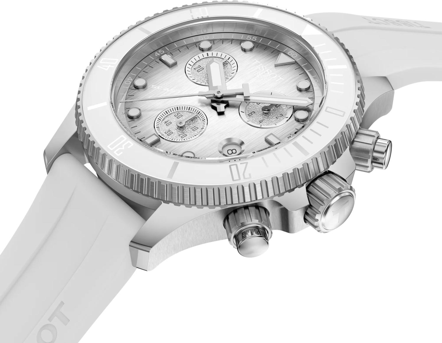 Оригинальные часы Tissot Seastar 1000 Quartz Chronograph с артикулом T120.217.17.011.00 предлагают свежее прочтение фирменного стиля бренда, совмещая точность движения и яркую индивидуальность. Корпус диаметром 38 мм и толщиной 12,95 мм выполнен из высококачественной нержавеющей стали 316L, гарантируя надежность, которая подойдет для большинства запястий. Эффектные швейцарские часы оснащены точным кварцевым хронографом, который питается от батареи Renata 394 и имеет полезную функцию EOL — индикатор окончания срока службы батареи. Помимо центральной секундной стрелки хронографа, функционал включает 30-минутный счетчик и счетчик 1/10 секунды, а также функции ADD и SPLIT для максимально точного замера времени. Круглый корпус дополнен однонаправленным вращающимся безелем с минеральным кольцом, завинчивающейся заводной головкой и задней крышкой, а также завинчивающимися кнопками. Циферблат градиентного бело-серого цвета с индексами защищен устойчивым к царапинам сапфировым стеклом с двусторонним антибликовым покрытием, а люминесцентное покрытие Super-LumiNova на стрелках обеспечивает отличную читаемость даже в темноте. Водонепроницаемость часов составляет 300 метров (30 АТМ/bar): можно плавать, погружаться с аквалангом на глубину 70 метров. Модель комплектуется белым силиконовым ремешком со стандартной застежкой и системой быстрой замены, а ушки имеют ширину 18 мм. Общий вес этих элегантных женских часов составляет всего 79 граммов.