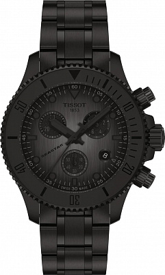 Выбирая оригинальные часы Tissot Seastar 1000 Quartz Chronograph 38mm, вы получаете надежный и стильный аксессуар, рожденный из наследия коллекции. Эти мужские часы в новом исполнении 38-миллиметрового кварцевого хронографа выражают фирменную индивидуальность коллекции, привнося точность в движение и характер в каждую деталь. Корпус из нержавеющей стали 316L с черным PVD-покрытием имеет круглую форму, длину 38 мм, ширину 38 мм и толщину 12,95 мм, а крепление ремешка (ушки) составляет 18 мм. Модель оснащена швейцарским кварцевым механизмом, калибр 10 1/2''' (23,3 мм в диаметре), имеет индикатор заряда батареи (EOL) и питается от батареи Renata 394. Функции хронографа включают 30-минутный и 1/10-секундный счетчики, центральную 60-секундную стрелку хронографа, а также функции ADD и SPLIT. Стойкое к царапинам сапфировое стекло с двусторонним антибликовым покрытием защищает циферблат градиентного серо-черного цвета с индексами. Люминесцентный материал Super-LumiNova на стрелках обеспечивает читаемость в условиях недостаточной освещенности. Опции корпуса включают минеральный безель, вращающийся против часовой стрелки, завинчивающуюся заводную головку и заднюю крышку, а также завинчивающиеся кнопки. Часы весят 131 г и комплектуются черным браслетом из нержавеющей стали с PVD-покрытием и раскладывающейся застежкой с системой безопасности, кнопками и функцией быстрой замены. Водозащита до давления 30 бар (300 м / 1000 футов) означает, что эти швейцарские часы подходят для плавания и погружения с аквалангом на глубину 70 метров.