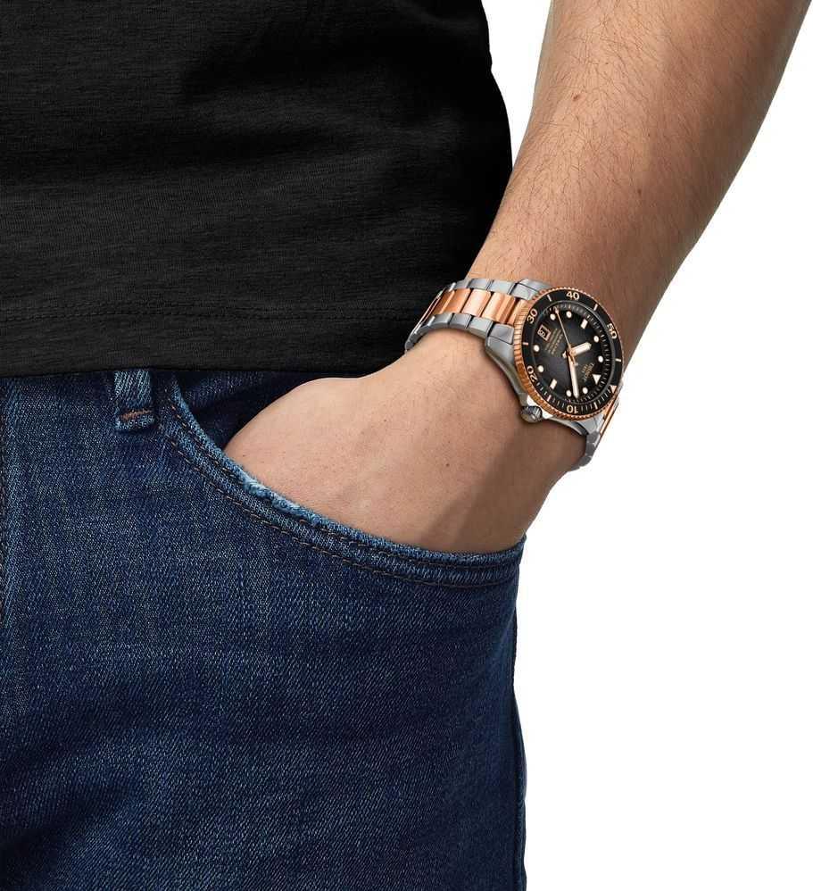 Изысканные мужские часы Tissot Seastar 1000 Powermatic 80 (артикул T120.807.22.051.01). Эти оригинальные часы получили тонко преображенный корпус диаметром 40 мм с изящным желобком по краям, что придает им более компактный и утонченный вид. Модель оснащена швейцарским автоматическим механизмом Powermatic 80 с запатентованной пружиной баланса Nivachron, обеспечивающим впечатляющий запас хода до 80 часов. Часы выполнены в круглом корпусе из нержавеющей стали 316L с PVD-покрытием цвета розового золота, дополненным минеральным безелем с вращением против часовой стрелки, завинчивающимися заводной головкой и задней крышкой, а также прозрачной задней крышкой для обзора механизма. Диаметр калибра составляет 25,6 мм. Циферблат градиентного серо-черного цвета украшен индексами, а стрелки и часовые метки покрыты составом Super-LumiNova для улучшенной видимости в условиях недостаточной освещенности. Защиту циферблата обеспечивает устойчивое к царапинам сапфировое стекло с антибликовым покрытием. Модель обладает отличной водозащитой 300 метров (30 АТМ/bar): можно плавать, погружаться с аквалангом на глубину 70 метров. Эти швейцарские часы на стальном браслете (с PVD-покрытием в оттенках серого и розового золота 5N) с быстросъемной системой крепления и раскладной застежкой с блокировкой и кнопками. Вес часов: 148 г.
