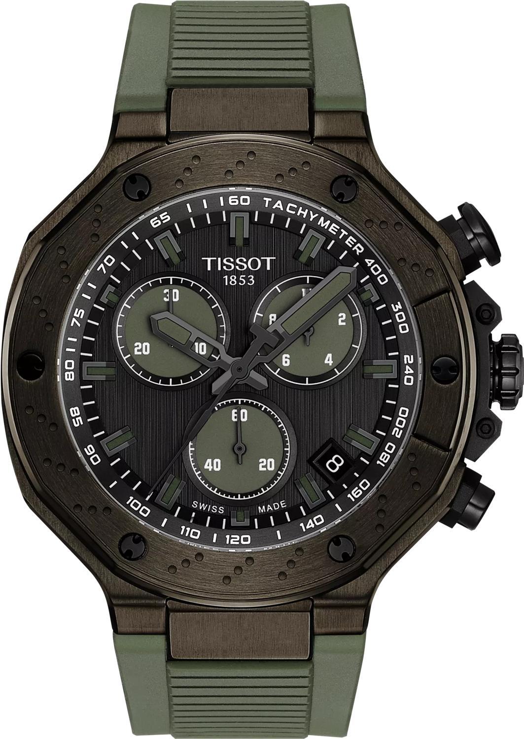 Воплощение спортивной элегантности, оригинальные часы Tissot T-Race Quartz Chronograph — это мужские швейцарские часы, созданные с вдохновением от мира мотогонок. Благодаря своему обновленному дизайну, модель сочетает в себе спортивные корни и более изящный циферблат, отражая динамизм мотоциклов и эмоции, которые дарит этот спорт. Сердце часов — швейцарский кварцевый механизм с функциями EOL (индикация окончания срока службы батарейки), 30-минутный и 1/10-секундный счетчики, центральная 60-секундная стрелка хронографа, а также функции ADD и SPLIT. Корпус часов выполнен из нержавеющей стали 316L с зеленым PVD-покрытием, а устойчивое к царапинам сапфировое стекло с антибликовым покрытием гарантирует повышенную прочность. Темно-серый циферблат с индексами и стрелками, покрытыми Super-LumiNova, обеспечивает отличную читаемость. Диаметр корпуса составляет 45 мм, толщина — 11,76 мм. Часы дополнены зеленым силиконовым ремешком со стандартной застежкой. Водозащита 100 метров (10 АТМ/bar): подходят для плавания и погружения на глубину 5-7 м (выдвигать заводную головку и нажимать кнопки, находясь в воде, нельзя). Вес часов — 112 г.