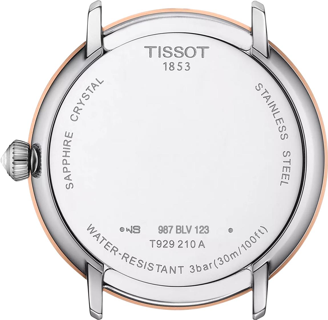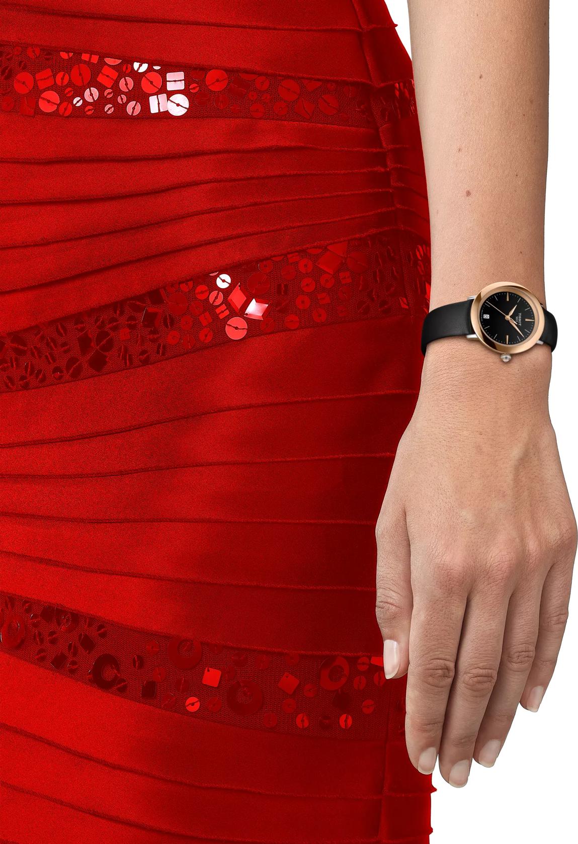 Изысканные оригинальные часы Tissot Glendora T929.210.46.051.00 — аксессуар, созданный для активных женщин, которые хотят подчеркнуть свое очарование роскошным и современным часовым изделием. Эти швейцарские часы выполнены в круглом корпусе из нержавеющей стали 316L, дополненном безелем из 18-каратного розового золота, что придает им особый шарм. Современный дизайн подчеркивается деталями: заводная головка украшена кабошоном в форме пирамиды, а противовес секундной стрелки скелетонизирован. Элегантность черного циферблата с индексами защищена устойчивым к появлению царапин сапфировым стеклом. Сердце модели — швейцарский кварцевый механизм калибра 10 1/2''' (диаметр 23.3 мм) с функцией EOL (индикатор окончания срока службы батареи), работающий от батареи Renata 371. Вес изделия составляет 40 г, а его габариты — длина 33 мм, ширина 33 мм и толщина 7.57 мм. Расстояние между ушками корпуса — 16 мм. Модель комплектуется черным кожаным ремешком с раскладной застежкой-бабочкой с кнопками, его длина 12h составляет 70 мм, а длина 6h — 105 мм. Часы имеют водонепроницаемость до давления 3 бар (30 м/100 футов), что обеспечивает минимальную защиту от мелких брызг, но они не предназначены для погружения в воду. Эти женские часы идеально подойдут для тех, кто ценит в аксессуарах сочетание качества и современного стиля.