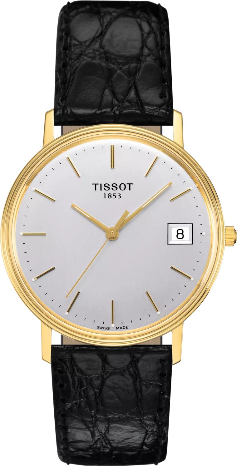 Воплощение элегантности и стиля в своей классической простоте, оригинальные часы Tissot Goldrun Hesalite Gold 33.7mm (артикул T71.3.401.31) — это истинное сокровище, которое можно хранить и передавать из поколения в поколение или приобрести в честь знаменательного события. Эти изысканные мужские часы созданы в Швейцарии и оснащены надежным швейцарским кварцевым механизмом (калибр 11 1/2'''), который работает от батареи типа Renata 371 и имеет функцию EOL (индикатор окончания срока службы элемента питания). Круглый корпус часов, диаметром 33,7 мм, выполнен из роскошного 18-каратного желтого золота, а его толщина составляет всего 6,55 мм. Серебристый циферблат с индексами защищен куполообразным хезалитовым стеклом, а стрелки покрыты люминесцентным составом Super-LumiNova для идеальной читаемости. Модель отображает часы, минуты, секунды и дату (HMSD). Масса изделия составляет 31,6 г. Водостойкость этих швейцарских часов обеспечивает минимальную защиту от мелких брызг (30 метров / 3 АТМ/bar). Часы не предназначены для погружения в воду. Элегантный образ дополняет черный кожаный ремешок со стандартной застежкой.