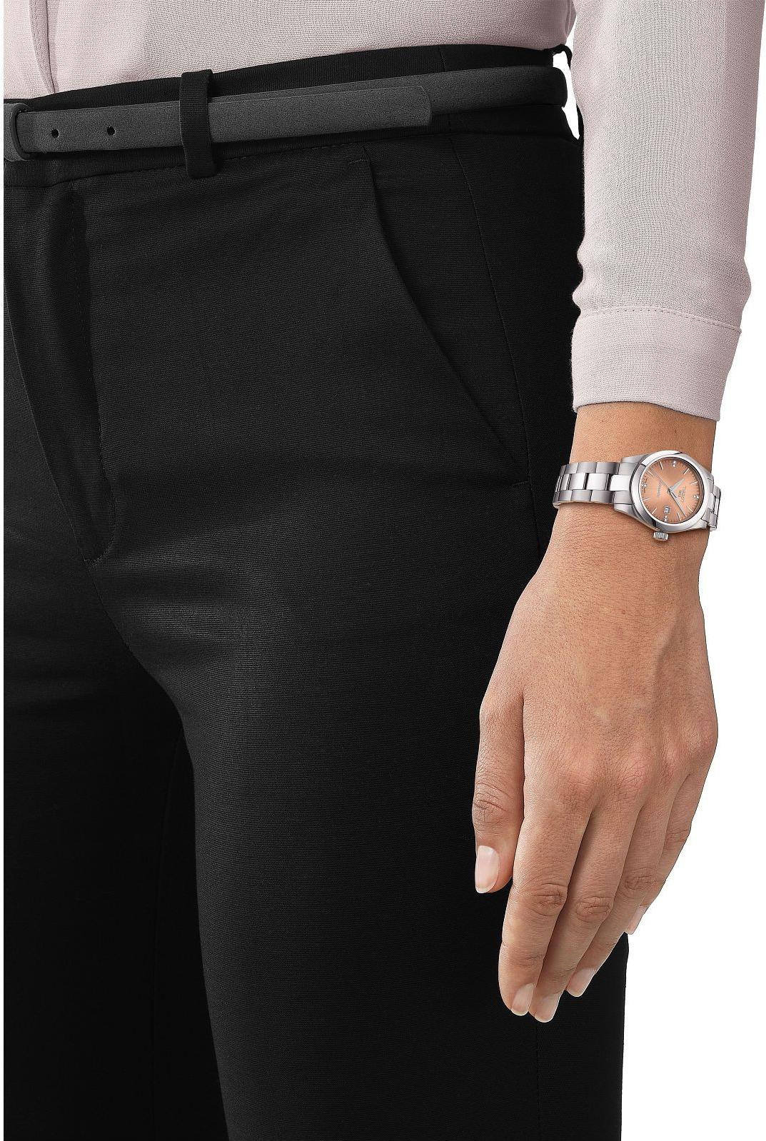 Оригинальные часы Tissot T-My Lady Automatic с артикулом T132.007.11.336.00 — это изящный женский аксессуар, ставший прекрасным дополнением к культовой коллекции Tissot Gentleman, который покоряет своей утонченной элегантностью, уместной в любой ситуации. Корпус круглой формы диаметром 29.3 мм и толщиной 10.6 мм выполнен из прочной нержавеющей стали 316L, а задняя крышка имеет прозрачное исполнение, позволяя любоваться работой механизма. Вес этих женских часов составляет 83 г, ширина ушка — 15 мм. Изысканный розовый циферблат украшен индексами и бриллиантами: 8 камней (характеристики бриллиантов: 0.02 карат, чистота VS-SI, цвет Top Wesselton, огранка «8/8 Single cut») расположены на отметках 3, 6, 9 и 12 часов. Дисплей защищен выпуклым сапфировым стеклом, устойчивым к появлению царапин. Внутри установлен надежный швейцарский автоматический механизм калибра 7 3/4''' (диаметр 17.2 мм), оснащенный запатентованной балансовой пружиной Nivachron, известной своей превосходной устойчивостью к воздействию магнитных полей, с запасом хода до 48 часов. Модель поставляется со стальным браслетом серого цвета и дополнительным кожаным ремешком коричневого оттенка, которые легко сменяются благодаря системе быстрой замены. Завершающим штрихом является застежка-бабочка с кнопками. Водонепроницаемость этих швейцарских часов составляет 100 метров (10 АТМ/bar): подходят для плавания и погружения на глубину 5–7 м (выдвигать заводную головку и нажимать кнопки, находясь в воде, нельзя).
