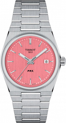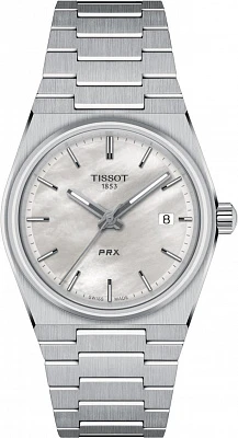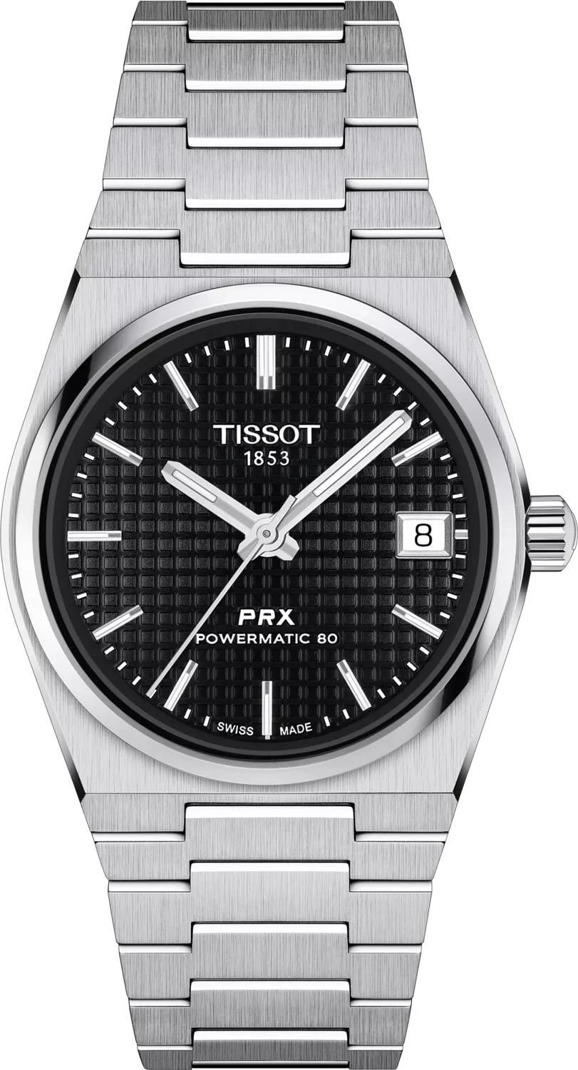 Представляем вашему вниманию оригинальные часы Tissot PRX 35mm Powermatic 80 (артикул T137.207.11.051.00) — завораживающее сочетание нестареющей элегантности и современных инноваций, идеальное для ценителей точных механизмов, ищущих стильные женские часы. Эти швейцарские часы имеют корпус «бочонок» (Tonneau) диаметром 35 мм и толщиной 10,93 мм, выполненный из высококачественной нержавеющей стали 316L с сатинированной отделкой и прозрачной задней крышкой, позволяющей любоваться работой автоматического механизма. Внутри находится швейцарский автоматический механизм Powermatic 80 с калибром 11 1/2''' (диаметр 25,6 мм) и запатентованной пружиной баланса Nivachron, обеспечивающий внушительный запас хода до 80 часов. Лаконичный черный циферблат с выразительным вафельным рисунком и накладными индексами — дань уважения культовым моделям 1978 года — надежно защищен устойчивым к царапинам сапфировым стеклом с антибликовым покрытием. Стрелки покрыты люминесцентным составом Super-LumiNova для идеальной читаемости. Модель оснащена стальным браслетом серого цвета со сменной системой быстрой замены и застежкой-бабочкой с кнопками, что гарантирует комфортную посадку на запястье. При весе 104 г часы обладают водонепроницаемостью 100 метров (10 АТМ/bar): подходят для плавания и погружения на глубину 5-7 м (выдвигать заводную головку и нажимать кнопки, находясь в воде, нельзя).
