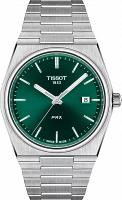 Надежные мужские оригинальные часы Tissot PRX 40mm — это современная интерпретация культовой модели 70-х годов, сочетающая классический стиль и высочайшее швейцарское качество. Бочковидный корпус из нержавеющей стали 316L имеет ширину 40 и толщину 10,4 мм, а расстояние между ушками составляет 12 мм. Элегантный зеленый циферблат с индексами защищен устойчивым к появлению царапин сапфировым стеклом. Читаемость в любых условиях обеспечивает люминесцентное покрытие Super-LumiNova на стрелках. Внутри установлен надежный швейцарский часый кварцевый механизм с калибром 11 1/2''' (диаметр 25,6 мм) и функцией EOL (индикатор окончания срока службы батареи). В часах используется батарейка типа Renata 371. Водозащита 100 метров (10 АТМ/bar): подходят для плавания и погружения на глубину 5-7 м (выдвигать заводную головку и нажимать кнопки, находясь в воде, нельзя). Модель комплектуется серым браслетом из нержавеющей стали с застежкой-бабочкой с кнопками и системой быстрой замены.