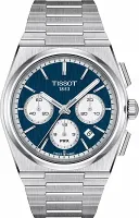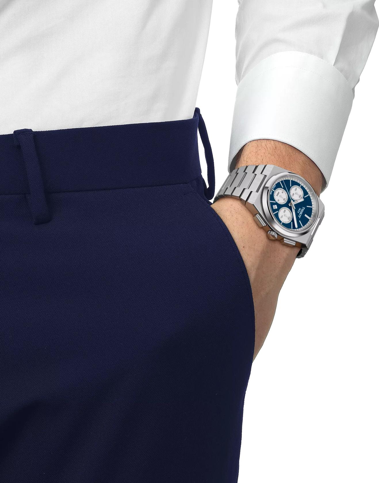 Мужские оригинальные часы Tissot PRX Automatic Chronograph 42mm — это настоящий must-have для ценителей дизайна и функциональности, возрождающий элегантную угловатую форму корпуса Tissot из 1978 года, но с современными характеристиками. Эти швейцарские часы выполнены в корпусе-бочке из нержавеющей стали 316L с сатинированной отделкой. Диаметр корпуса составляет 42 мм, а толщина — 14,54 мм, длина — 41,5 мм. Благодаря прозрачной задней крышке можно наблюдать за работой механизма. Модель оснащена швейцарским автоматическим механизмом Tissot калибра 13 1/4''' (диаметр 30 мм) с увеличенным до 60 часов запасом хода Valjoux A05.H31. Этот калибр обеспечивает классическую компоновку циферблата хронографа с дополнительными счетчиками на 3, 6 и 9 часах. Функционал включает центральную 60-секундную стрелку хронографа, а также 12-часовой, 30-минутный и 60-секундный счетчики. Синий циферблат с индексами и белыми счетчиками защищен устойчивым к царапинам сапфировым стеклом с антибликовым покрытием. На стрелках нанесено люминесцентное покрытие Super-LumiNova. Вес часов составляет 184 г. Уровень водозащиты 100 метров (10 АТМ/bar): подходят для плавания и погружения на глубину 5–7 м (выдвигать заводную головку и нажимать кнопки, находясь в воде, нельзя). Часы комплектуются браслетом из нержавеющей стали серого цвета с быстросъемной системой и застежкой-бабочкой с кнопками.