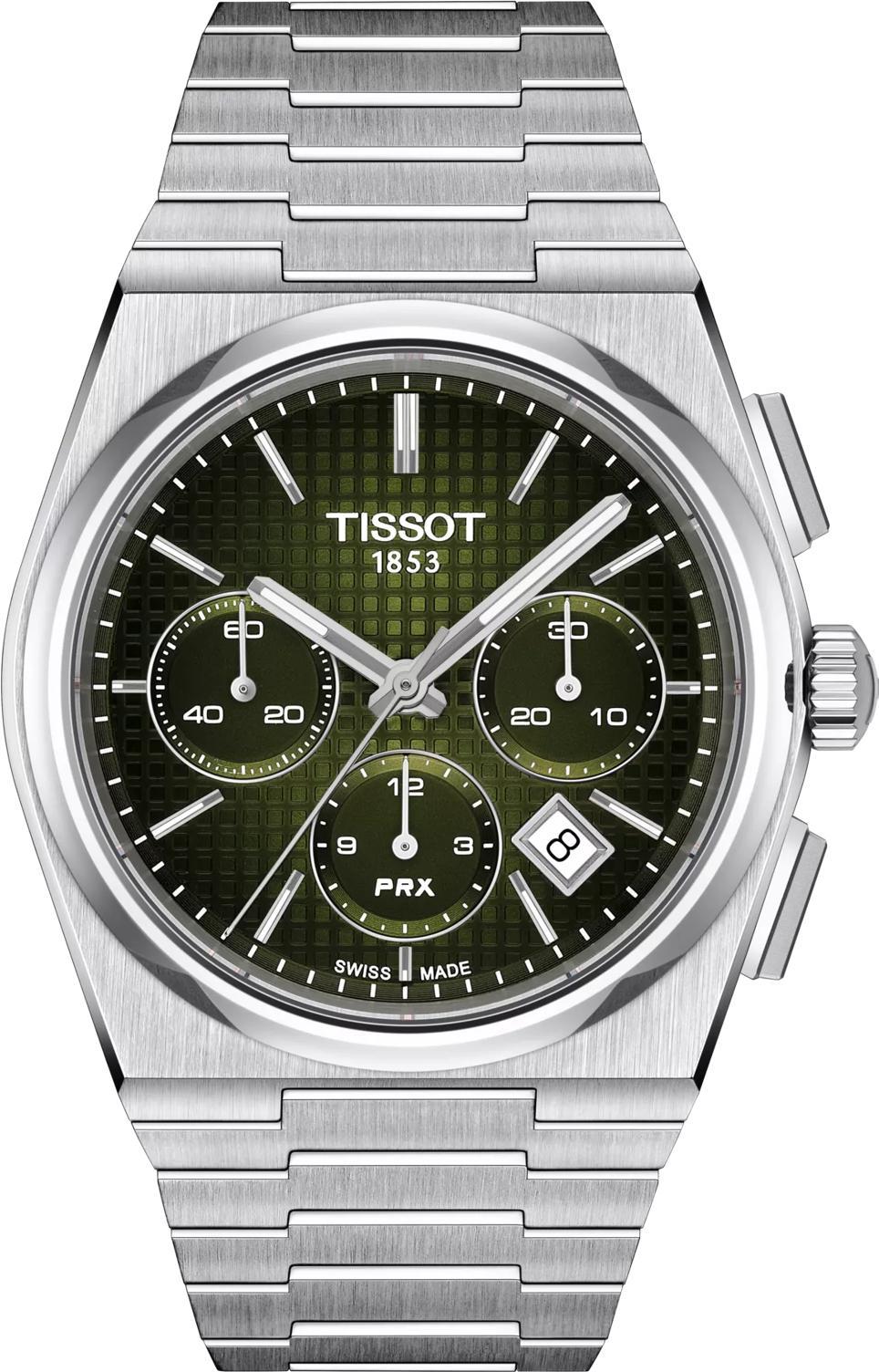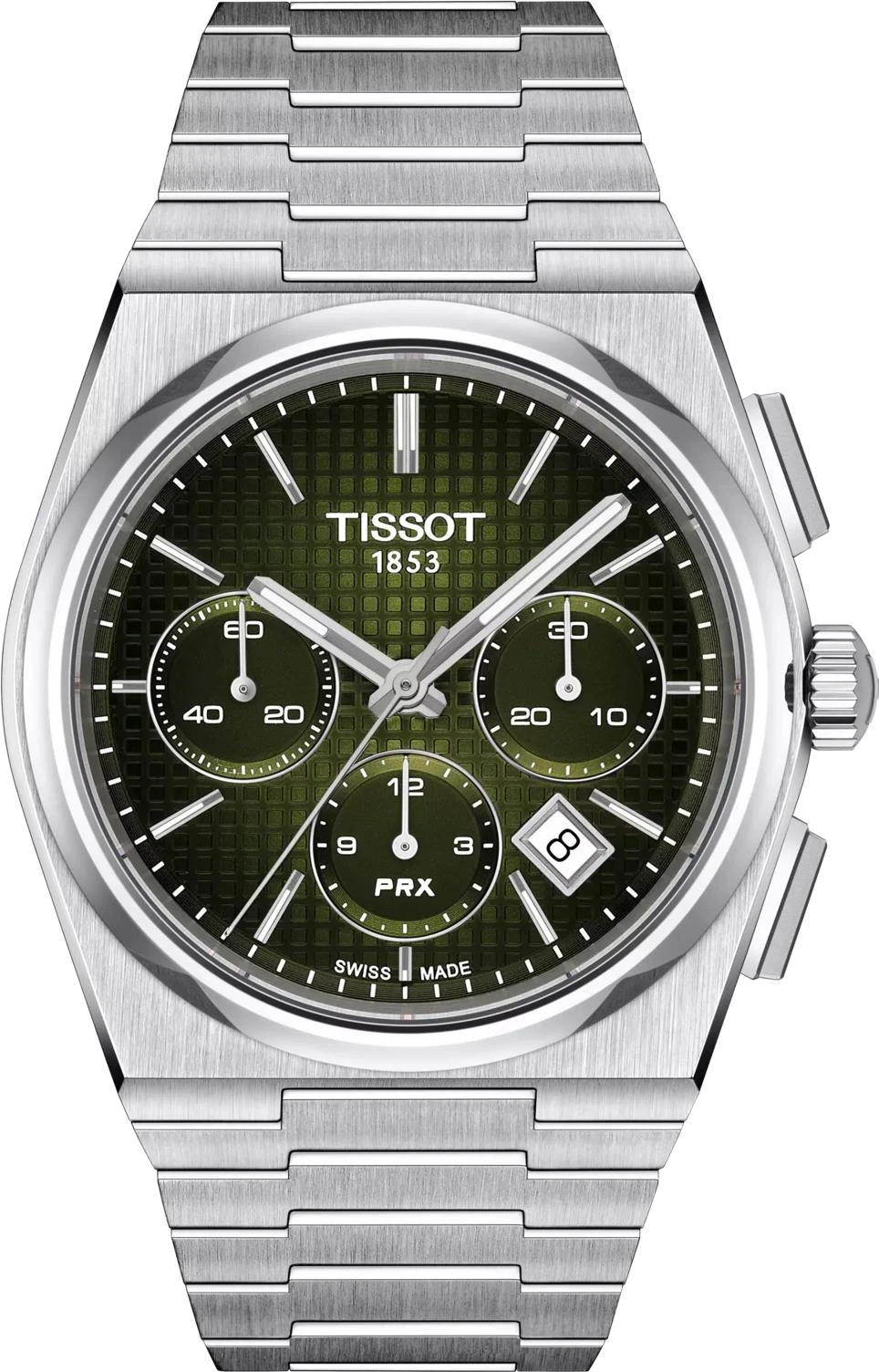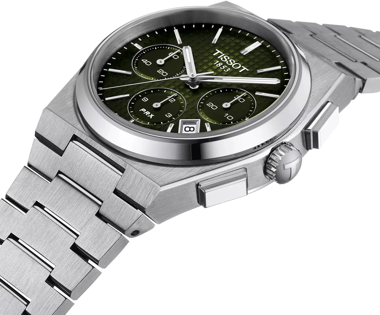 Приобретите для себя или в подарок эти великолепные мужские часы Tissot PRX Automatic Chronograph 42mm — настоящие оригинальные часы, сочетающие узнаваемый угловатый корпус Tissot 1978 года с современными характеристиками и ставшие обязательным приобретением в списке желаний каждого ценителя. Корпус шириной 42 мм и длиной 41,5 мм, выполненный из нержавеющей стали 316L, имеет форму «бочка» и сатинированную отделку, что, вместе с циферблатом градиентного зеленого цвета с индексами, подчеркивает непринужденный стиль спортивных часов 1970-х годов. Толщина корпуса составляет 14,54 мм, а его задняя крышка выполнена прозрачной. Вес этой модели — 184 г. Эти швейцарские часы работают благодаря автоматическому хронографу Valjoux A05.H31 с калибром 13 1/4''' (диаметр 30 мм), который обеспечивает классическое расположение счетчиков хронографа на 3, 6 и 9 часах. Механизм имеет патентованную пружину баланса Nivachron и запас хода до 68 часов, а его функции включают 12-часовой, 30-минутный и 60-секундный счетчики, а также центральную 60-секундную стрелку хронографа. Защиту циферблата обеспечивает устойчивое к появлению царапин сапфировое стекло с антибликовым покрытием, а на стрелки нанесено люминесцентное покрытие Super-LumiNova. Браслет из нержавеющей стали серого цвета, который легко снимается благодаря системе быстрой замены, а застежка — раскладная с кнопками, тип «бабочка». Водонепроницаемость этих часов составляет 100 метров (10 АТМ/bar): они подходят для плавания и погружения на глубину 5–7 м (выдвигать заводную головку и нажимать кнопки, находясь в воде, нельзя).