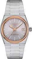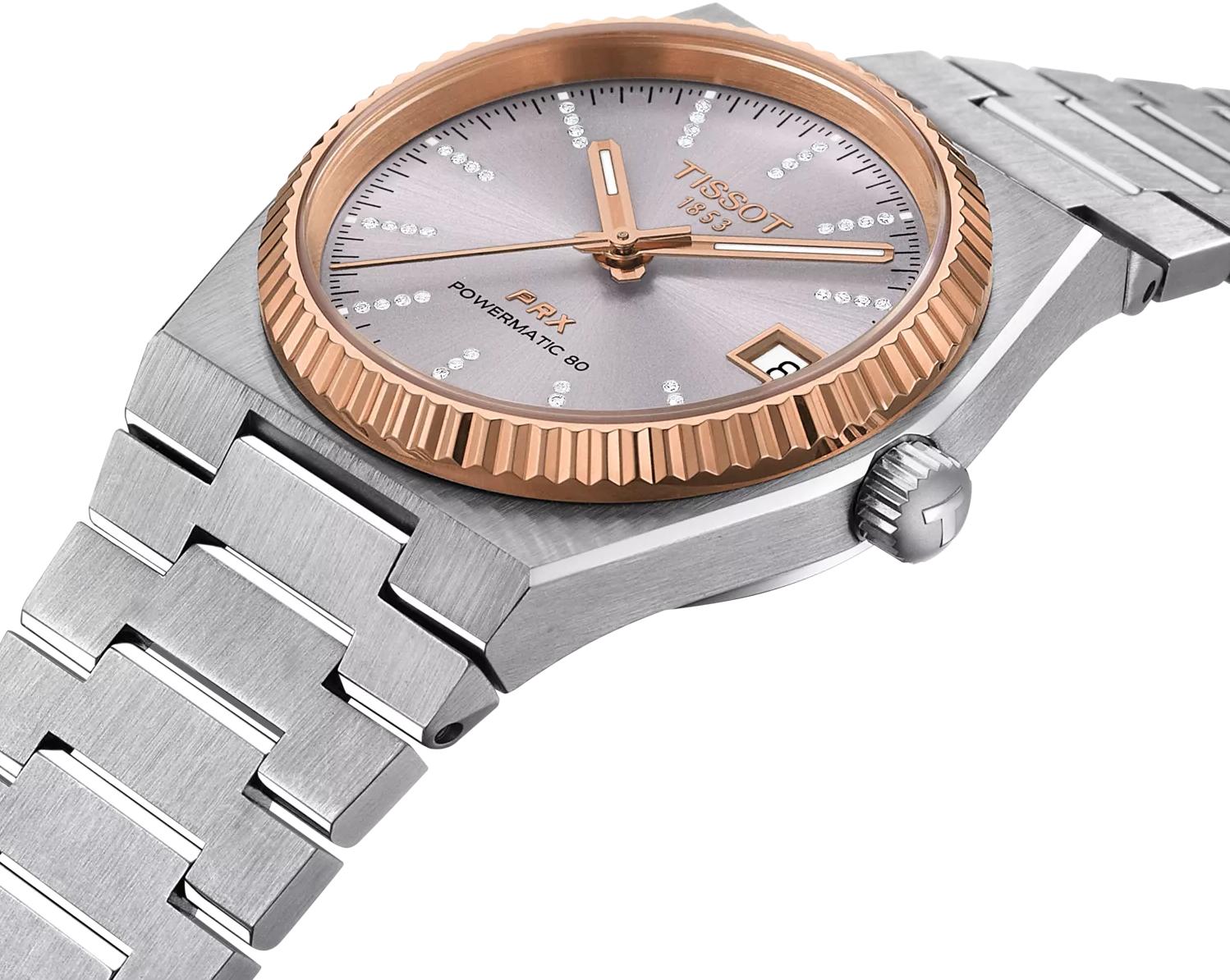 Откройте для себя оригинальные часы Tissot PRX Gold 35mm — эталон стиля и элегантности, возрождающий аутентичный дух 70-х и гармонично сочетающий его с инновационными функциями 21 века. Созданные для ценителей дизайна и точности, эти женские часы станут желанным дополнением к вашей коллекции. Модель T931.207.41.336.00 оснащена швейцарским автоматическим механизмом Powermatic 80, который гарантирует надежность и высокую точность благодаря инновационной пружине баланса Nivachron. Механизм с 25,6 мм в диаметре калибра 11 1/2''' обладает впечатляющим запасом хода до 80 часов, идеально подходящим для динамичного образа жизни. Корпус в форме «бочка» с габаритами 34,6 x 35,0 мм и толщиной 10,93 мм выполнен из нержавеющей стали 316L и дополнен роскошным безелем из 18-каратного розового золота, придающим этому шедевру исключительный характер. Защиту циферблата обеспечивает устойчивое к царапинам сапфировое стекло с антибликовым покрытием, а сквозь прозрачную заднюю крышку можно наблюдать за работой механизма. Серый циферблат украшен 44 бриллиантами (VS-SI, 8/8 Single cut, Top Wesselton) общим весом 0,07 карата в качестве индексов, а стрелки покрыты люминесцентным составом Super-LumiNova. Модель весом 98 г дополнена серым стальным браслетом с системой быстрой замены и застежкой-бабочкой с кнопками. Водонепроницаемость составляет 100 метров (10 АТМ/bar) — эти швейцарские часы подходят для плавания и погружения на глубину 5-7 м (выдвигать заводную головку и нажимать кнопки, находясь в воде, нельзя).