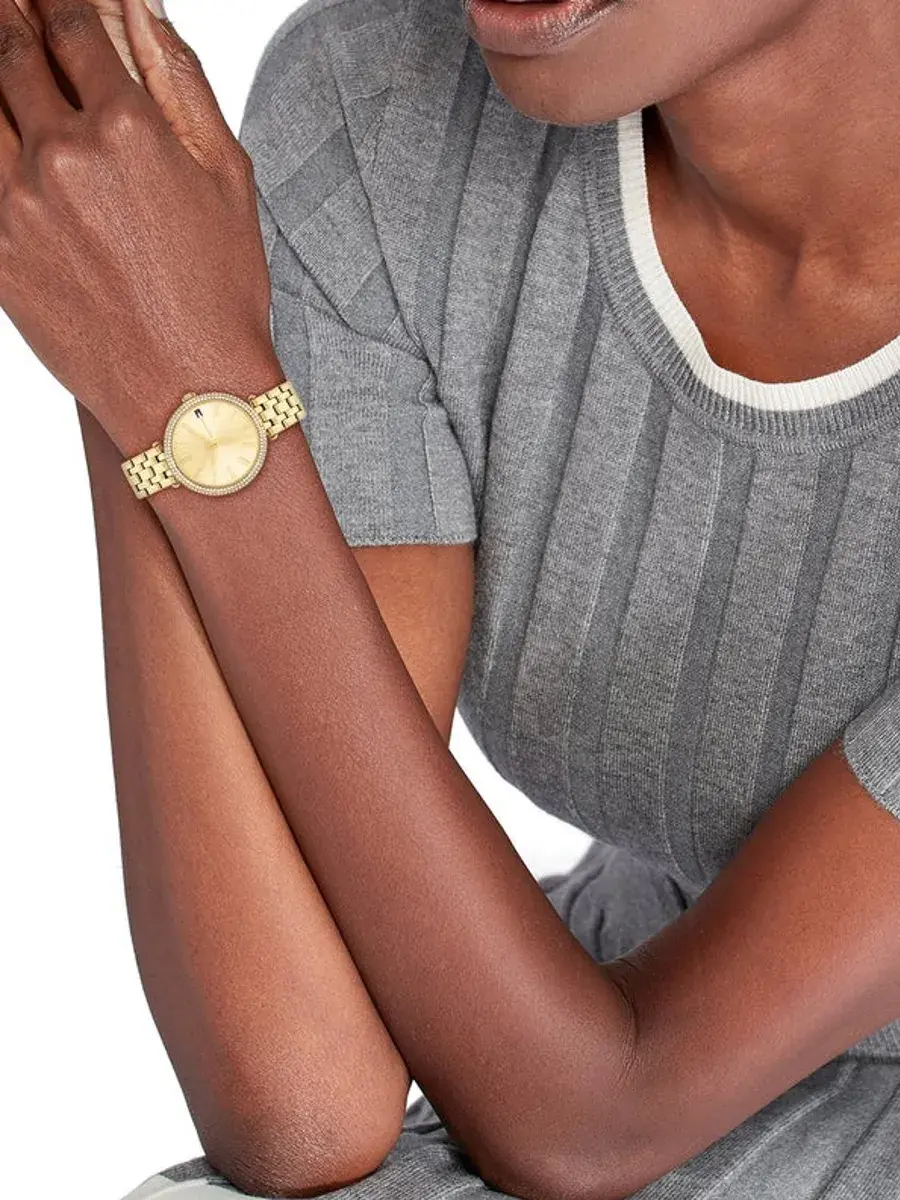 . Точный кварцевый механизм с аналоговой индикацией. В отличие от механических часов, не требуют завода и работают от батареи, показывая отклонение всего несколько секунд в месяц. Браслет из нержавеющей стали обладает высокой прочностью и износостойкостью, обеспечивая долговечность даже при активной эксплуатации. Материал устойчив к коррозии и сохраняет свой внешний вид надолго. Корпус изготовлен из высококачественной нержавеющей стали 316L с высокими антикоррозийными свойствами. Прочное, устойчивое к царапинам минеральное стекло защищает часы от повреждений. Часы являются водонепроницаемыми до 3 Бар. Цвет корпуса: Желтое золото. Цвет циферблата: Золотистый. Высота (с ушками): 34 мм. Толщина: 7 мм. Гарантия: 1 год.