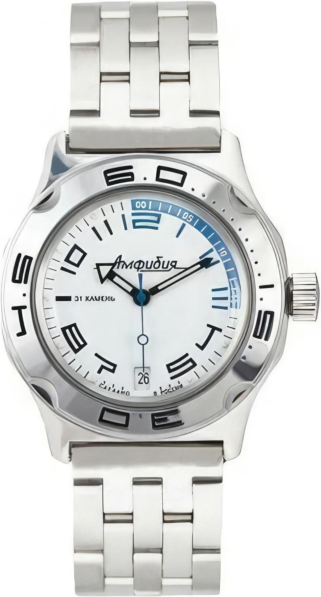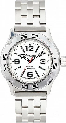 Мужские наручные часы Восток Амфибия 100473. Автоматические с ручным подзаводом. Пружина механизма заводится автоматически благодаря естественным движениям владельца в процессе ежедневной носки часов. Также есть возможность ручного завода. Корпус изготовлен из высококачественной нержавеющей стали 316L с высокими антикоррозийными свойствами. На стрелки и отметки нанесен светонакопительный состав, благодаря этому считывать информацию с циферблата возможно и в темноте. На циферблате отображается текущее число месяца. Браслет из нержавеющей стали. Органическое стекло. Часы являются водонепроницаемыми до 20 Бар. Цвет корпуса: Белый. Цвет циферблата: Белый. Ширина (с заводной головкой): 42мм. Толщина: 15мм. Гарантия: 1 год.
