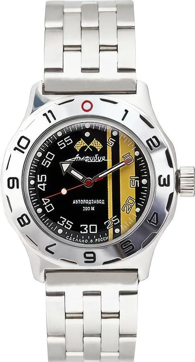 Мужские наручные часы Восток Амфибия 100652. Автоматические с ручным подзаводом. Пружина механизма заводится автоматически благодаря естественным движениям владельца в процессе ежедневной носки часов. Также есть возможность ручного завода. Корпус изготовлен из высококачественной нержавеющей стали 316L с высокими антикоррозийными свойствами. На стрелки и отметки нанесен светонакопительный состав, благодаря этому считывать информацию с циферблата возможно и в темноте. Браслет из нержавеющей стали. Органическое стекло. Часы являются водонепроницаемыми до 20 Бар. Цвет корпуса: Черный. Цвет циферблата: Черный. Ширина (с заводной головкой): 42мм. Толщина: 15мм. Гарантия: 1 год.
