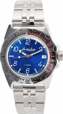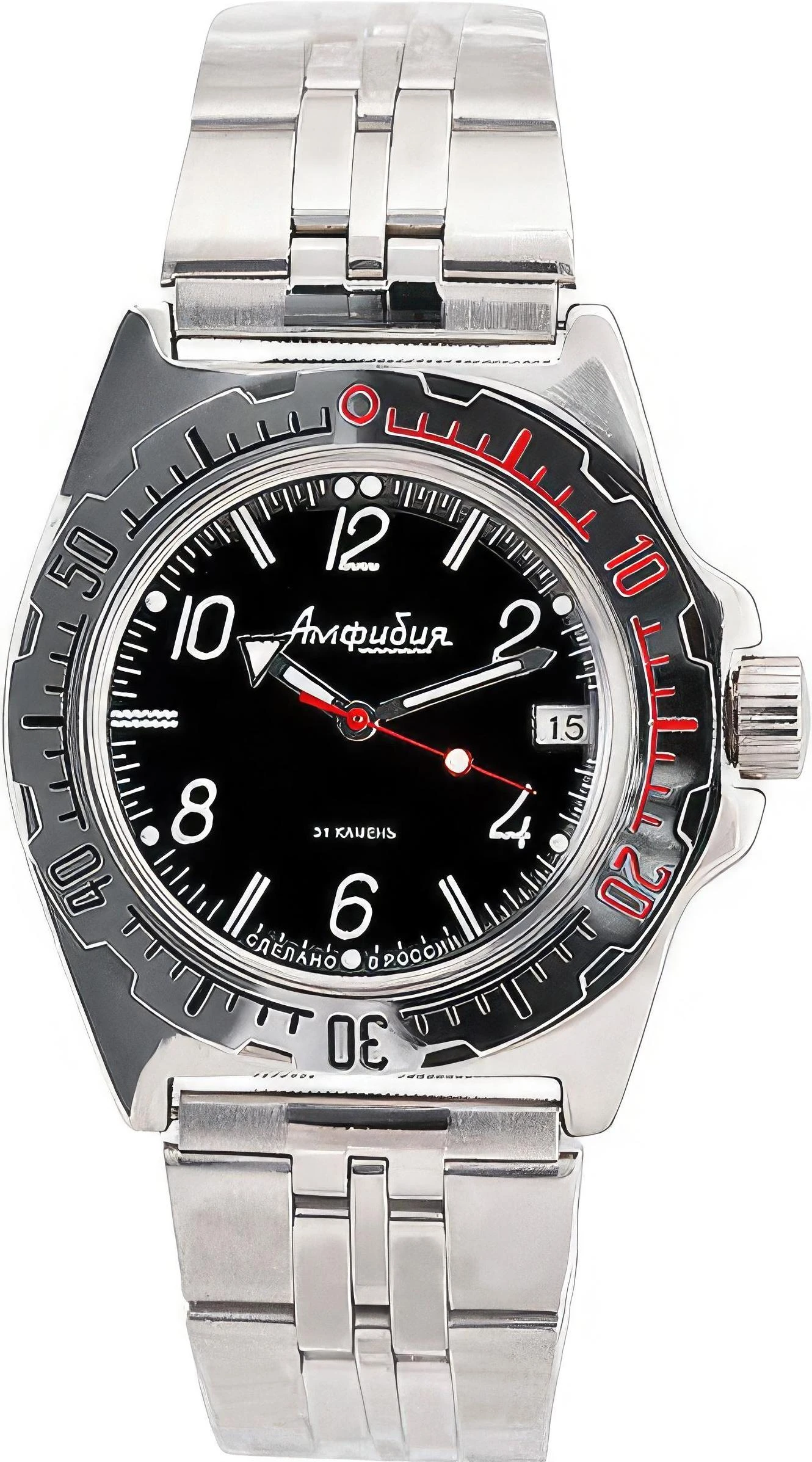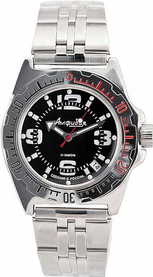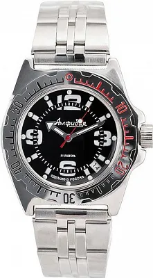 Мужские наручные часы Восток Амфибия 110909. Автоматические с ручным подзаводом. Пружина механизма заводится автоматически благодаря естественным движениям владельца в процессе ежедневной носки часов. Также есть возможность ручного завода. Корпус изготовлен из высококачественной нержавеющей стали 316L с высокими антикоррозийными свойствами. На стрелки и отметки нанесен светонакопительный состав, благодаря этому считывать информацию с циферблата возможно и в темноте. На циферблате отображается текущее число месяца. Браслет из нержавеющей стали. Органическое стекло. Часы являются водонепроницаемыми до 20 Бар. Цвет корпуса: Черный. Цвет циферблата: Черный. Ширина (с заводной головкой): 42мм. Толщина: 15мм. Гарантия: 1 год.