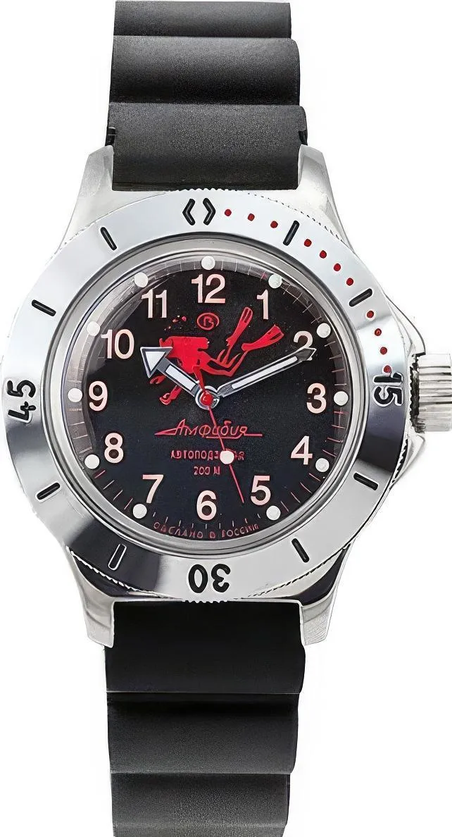 Мужские наручные часы Восток Амфибия 120657. Автоматические с ручным подзаводом. Пружина механизма заводится автоматически благодаря естественным движениям владельца в процессе ежедневной носки часов. Также есть возможность ручного завода. Корпус изготовлен из высококачественной нержавеющей стали 316L с высокими антикоррозийными свойствами. На стрелки и отметки нанесен светонакопительный состав, благодаря этому считывать информацию с циферблата возможно и в темноте. Ремешок изготовлен из каучука. Органическое стекло. Часы являются водонепроницаемыми до 20 Бар. Цвет корпуса: Черный. Цвет циферблата: Черный. Ширина (с заводной головкой): 42мм. Толщина: 15мм. Гарантия: 1 год.