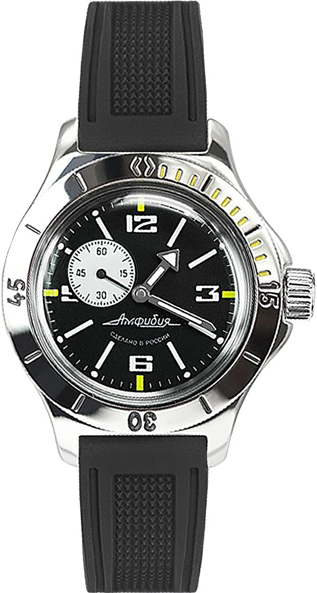 Мужские наручные часы Восток Амфибия 12073Б. Механические с ручным подзаводом. Полимерный ремешок. Натуральный полимерный материал является идеальным для изготовления ремешка благодаря своей чрезвычайной прочности и гибкости. Ударопрочная конструкция часов защищает от ударов и вибрации. Браслет из нержавеющей стали. Органическое стекло. Часы являются водонепроницаемыми до 20 Бар. Цвет циферблата: Серебристый. Цвет корпуса: Черный. На стрелки и отметки нанесен светонакопительный состав, благодаря этому считывать информацию с циферблата возможно и в темноте. Толщина: 15 мм. Гарантия: 1 год.