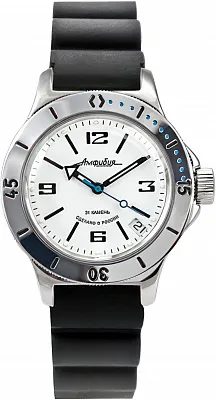 Мужские наручные часы Восток Амфибия 120811. Механические с автоподзаводом. Пружина механизма заводится автоматически благодаря естественным движениям владельца в процессе ежедневной носки часов. Корпус изготовлен из высококачественной нержавеющей стали 316L с высокими антикоррозийными свойствами. На стрелки и отметки нанесен светонакопительный состав, благодаря этому считывать информацию с циферблата возможно и в темноте. Полимерный ремешок. Натуральный полимерный материал является идеальным для изготовления ремешка благодаря своей чрезвычайной прочности и гибкости. Органическое стекло. Часы являются водонепроницаемыми до 20 Бар. Цвет корпуса: Черный. Цвет циферблата: Черный. Ширина (с заводной головкой): 42мм. Толщина: 15мм. Гарантия: 1 год.