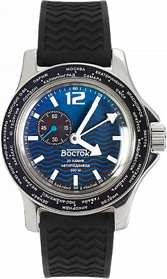 Мужские наручные часы Восток Амфибия 13003В. Механические с ручным подзаводом. Полимерный ремешок. Натуральный полимерный материал является идеальным для изготовления ремешка благодаря своей чрезвычайной прочности и гибкости. Отображение времени возможно в 12-часовом или 24-часовом формате. Браслет из нержавеющей стали. Органическое стекло. Часы являются водонепроницаемыми до 20 Бар. Цвет циферблата: Черный. Цвет корпуса: Синий. На стрелки и отметки нанесен светонакопительный состав, благодаря этому считывать информацию с циферблата возможно и в темноте. Высота (с ушками): 49 мм. Толщина: 15 мм. Гарантия: 1 год.