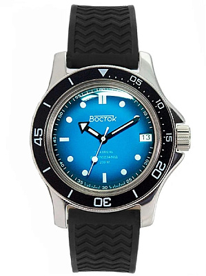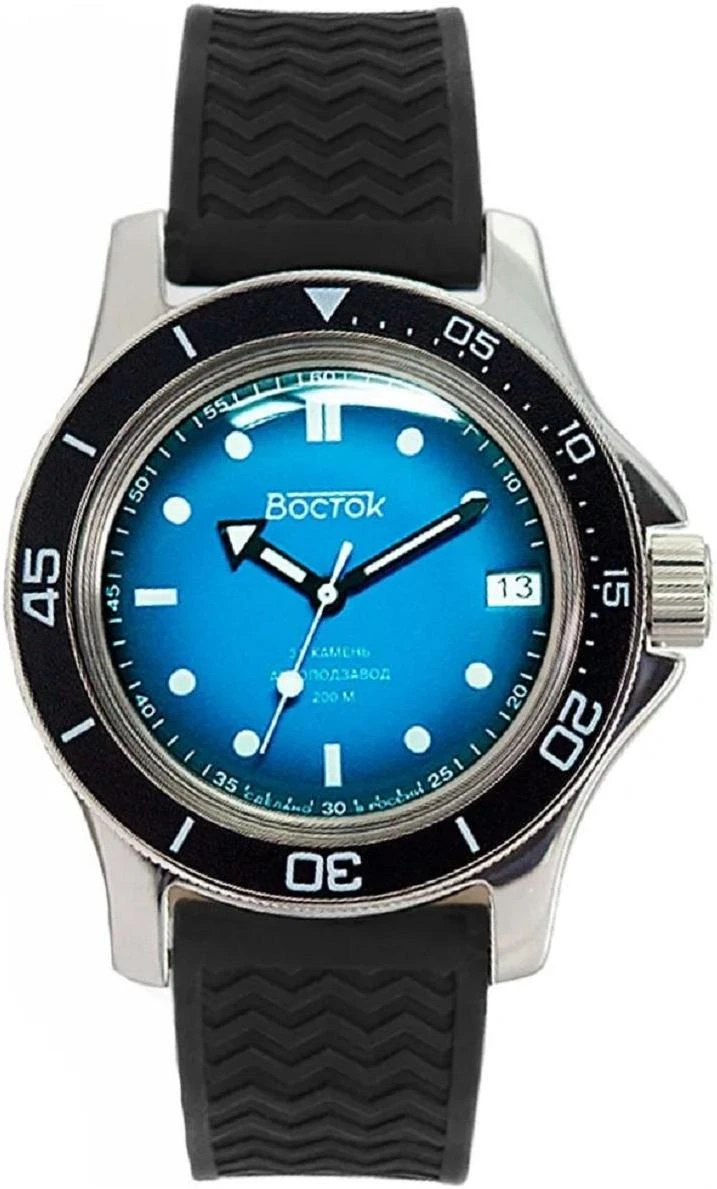 Мужские наручные часы Восток Амфибия 13031В. Механические с ручным подзаводом. Полимерный ремешок. Натуральный полимерный материал является идеальным для изготовления ремешка благодаря своей чрезвычайной прочности и гибкости. Ударопрочная конструкция часов защищает от ударов и вибрации. Браслет из нержавеющей стали. Органическое стекло. На циферблате отображается текущее число месяца. Часы являются водонепроницаемыми до 20 Бар. Цвет циферблата: Черный. Цвет корпуса: Синий. На стрелки и отметки нанесен светонакопительный состав, благодаря этому считывать информацию с циферблата возможно и в темноте. Толщина: 13 мм. Гарантия: 1 год.