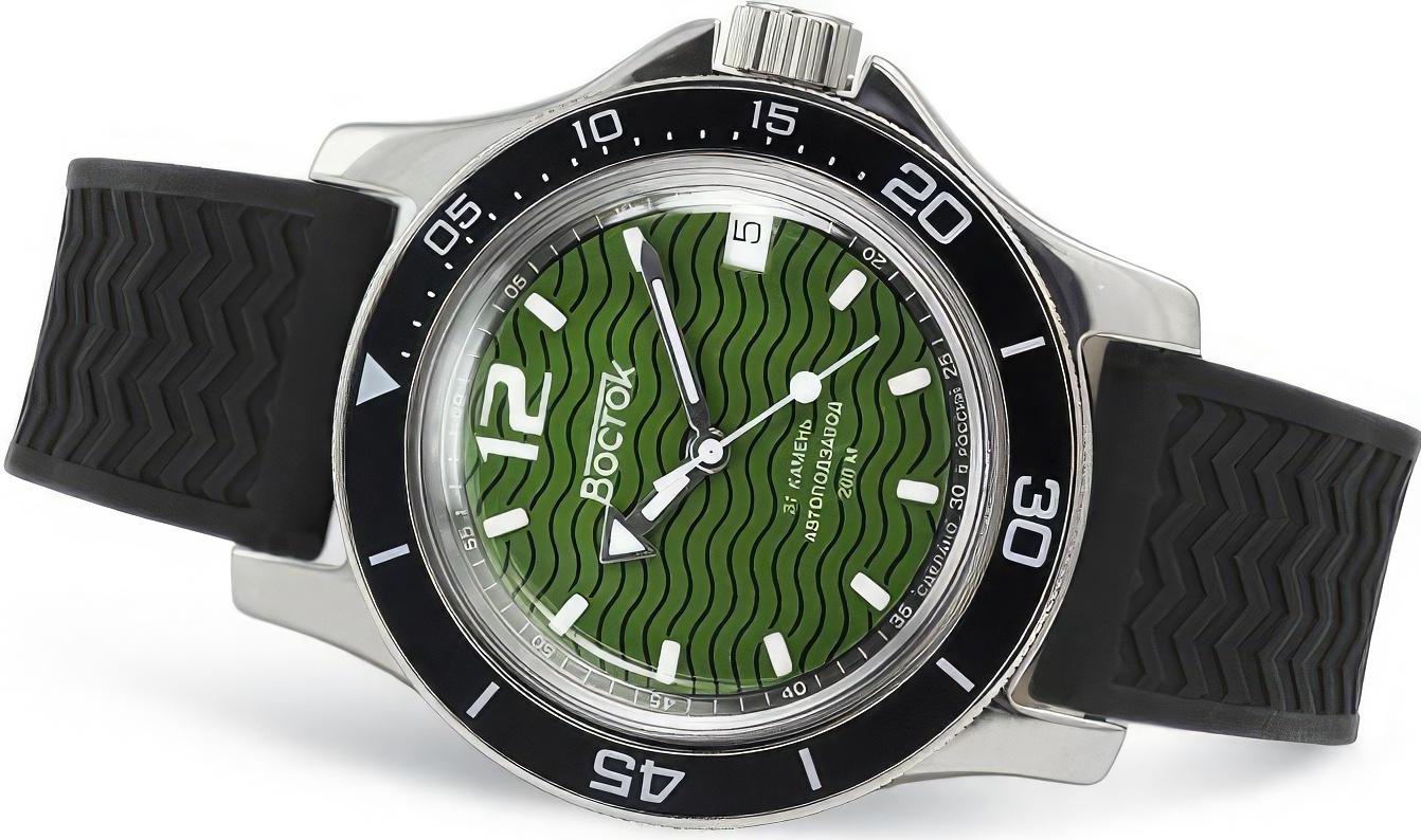 Мужские наручные часы Восток Амфибия 13041A. Механические с ручным подзаводом. Полимерный ремешок. Натуральный полимерный материал является идеальным для изготовления ремешка благодаря своей чрезвычайной прочности и гибкости. Браслет из нержавеющей стали. Органическое стекло. На циферблате отображается текущее число месяца. Часы являются водонепроницаемыми до 20 Бар. Цвет циферблата: Серебристый. Цвет циферблата: Черный. Цвет корпуса: Зеленый. На стрелки и отметки нанесен светонакопительный состав, благодаря этому считывать информацию с циферблата возможно и в темноте. Толщина: 13 мм. Гарантия: 1 год.
