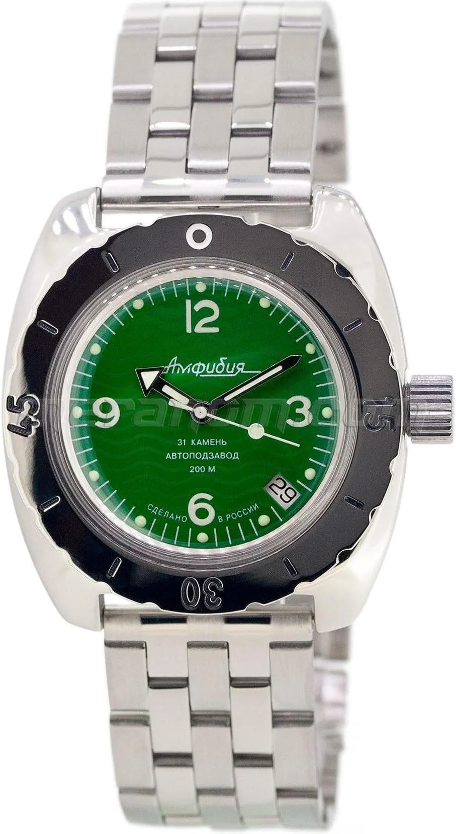Мужские наручные часы Восток Амфибия 150348. Механические с автоподзаводом. Пружина механизма заводится автоматически благодаря естественным движениям владельца в процессе ежедневной носки часов. Корпус изготовлен из высококачественной нержавеющей стали 316L с высокими антикоррозийными свойствами. На стрелки и отметки нанесен светонакопительный состав, благодаря этому считывать информацию с циферблата возможно и в темноте. На циферблате отображается текущее число месяца. Браслет из нержавеющей стали. Органическое стекло. Часы являются водонепроницаемыми до 20 Бар. Цвет корпуса: Зеленый. Цвет циферблата: Зеленый. Ширина (с заводной головкой): 42мм. Толщина: 15мм. Гарантия: 1 год.