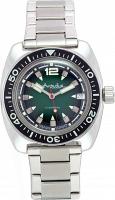 Мужские наручные часы Восток Амфибия 15051Г. Механические с автоподзаводом. Пружина механизма заводится автоматически благодаря естественным движениям владельца в процессе ежедневной носки часов. На стрелки и отметки нанесен светонакопительный состав, благодаря этому считывать информацию с циферблата возможно и в темноте. Браслет из нержавеющей стали обладает высокой прочностью и износостойкостью, обеспечивая долговечность даже при активной эксплуатации. Материал устойчив к коррозии и сохраняет свой внешний вид надолго. Ударопрочная конструкция часов защищает от ударов и вибрации. Корпус изготовлен из высококачественной нержавеющей стали 316L с высокими антикоррозийными свойствами. Органическое стекло. Часы являются водонепроницаемыми до 20 Бар. Цвет корпуса: Серебристый. Цвет циферблата: Зеленый. Высота (с ушками): 46.1 мм. Толщина: 15 мм. Гарантия: 1 год.