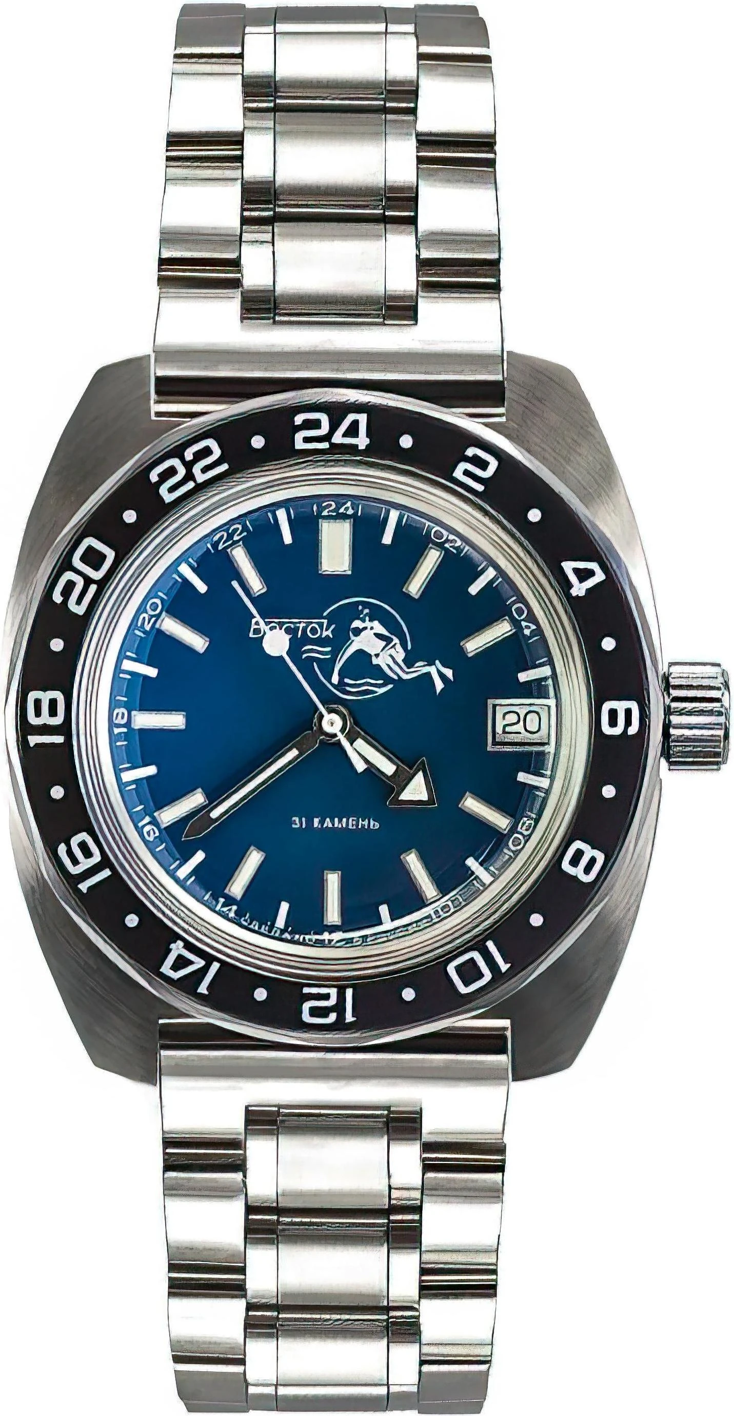Мужские наручные часы Восток Амфибия 17003Б. Механические с ручным подзаводом. Браслет из нержавеющей стали. Браслет из нержавеющей стали. Органическое стекло. На циферблате отображается текущее число месяца. Часы являются водонепроницаемыми до 20 Бар. Цвет циферблата: Серебристый. Цвет циферблата: Черный. Цвет корпуса: Синий. На стрелки и отметки нанесен светонакопительный состав, благодаря этому считывать информацию с циферблата возможно и в темноте. Толщина: 14 мм. Гарантия: 1 год.